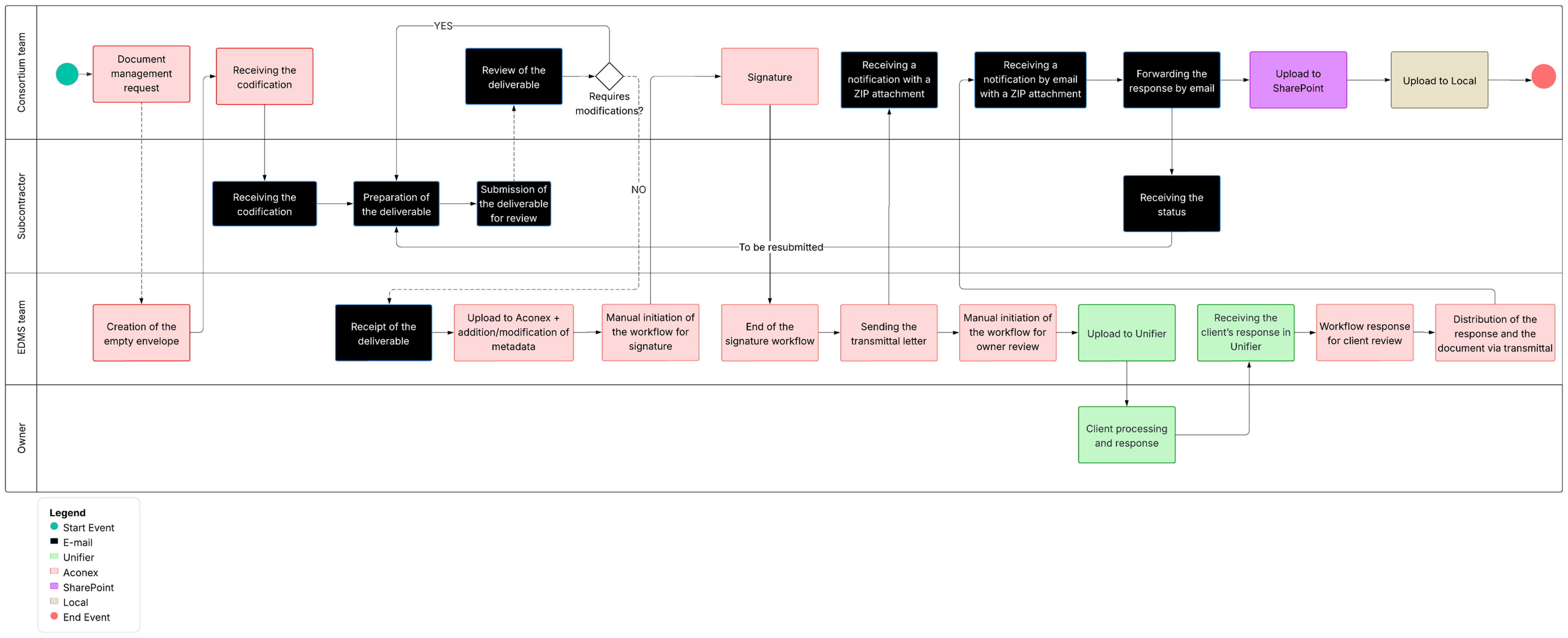 - Email-based exchanges with subcontractors: All communication and document reviews with subcontractors are conducted outside the official platforms, via basic email, without systematic archiving or guaranteed traceability.