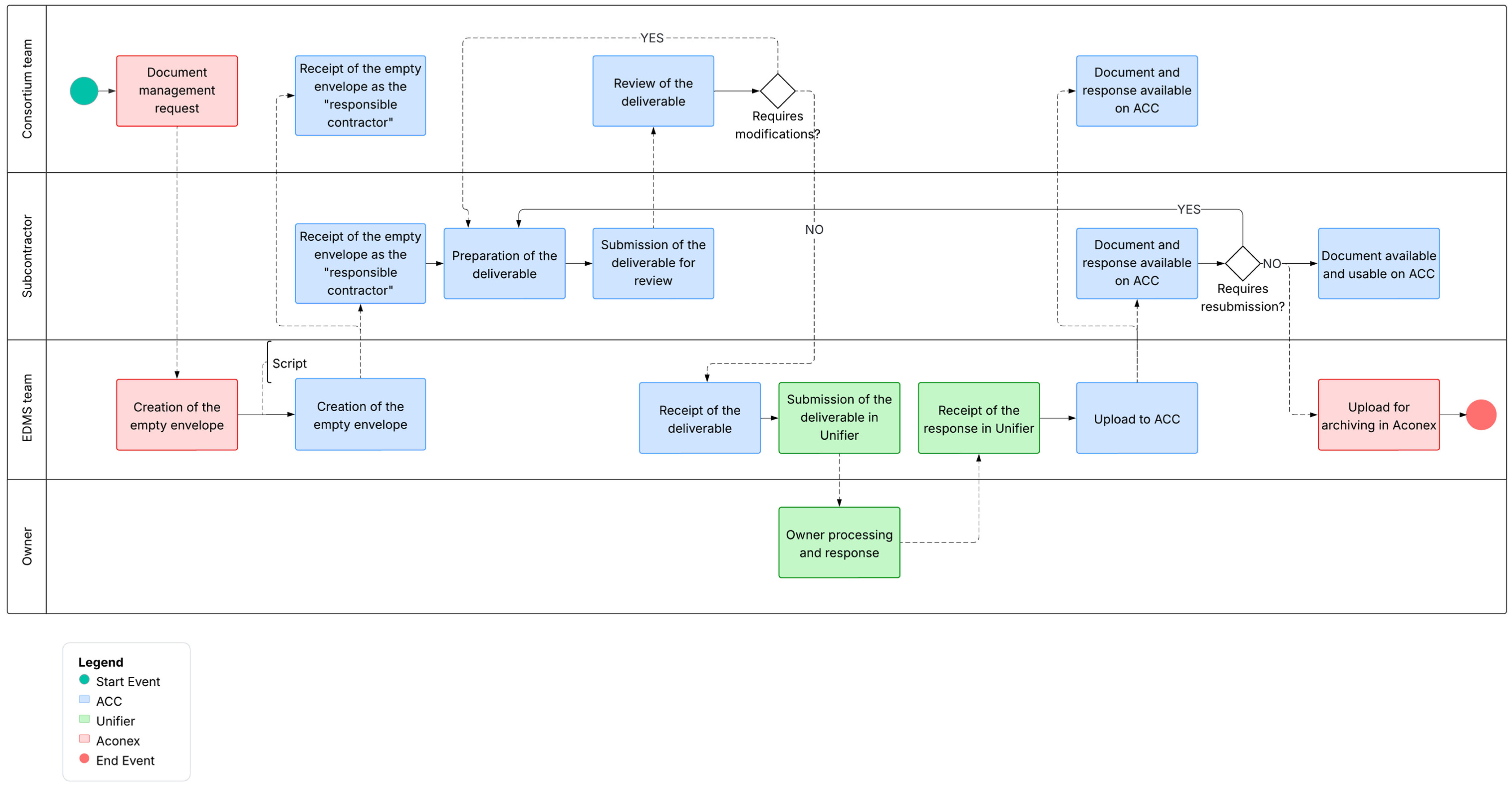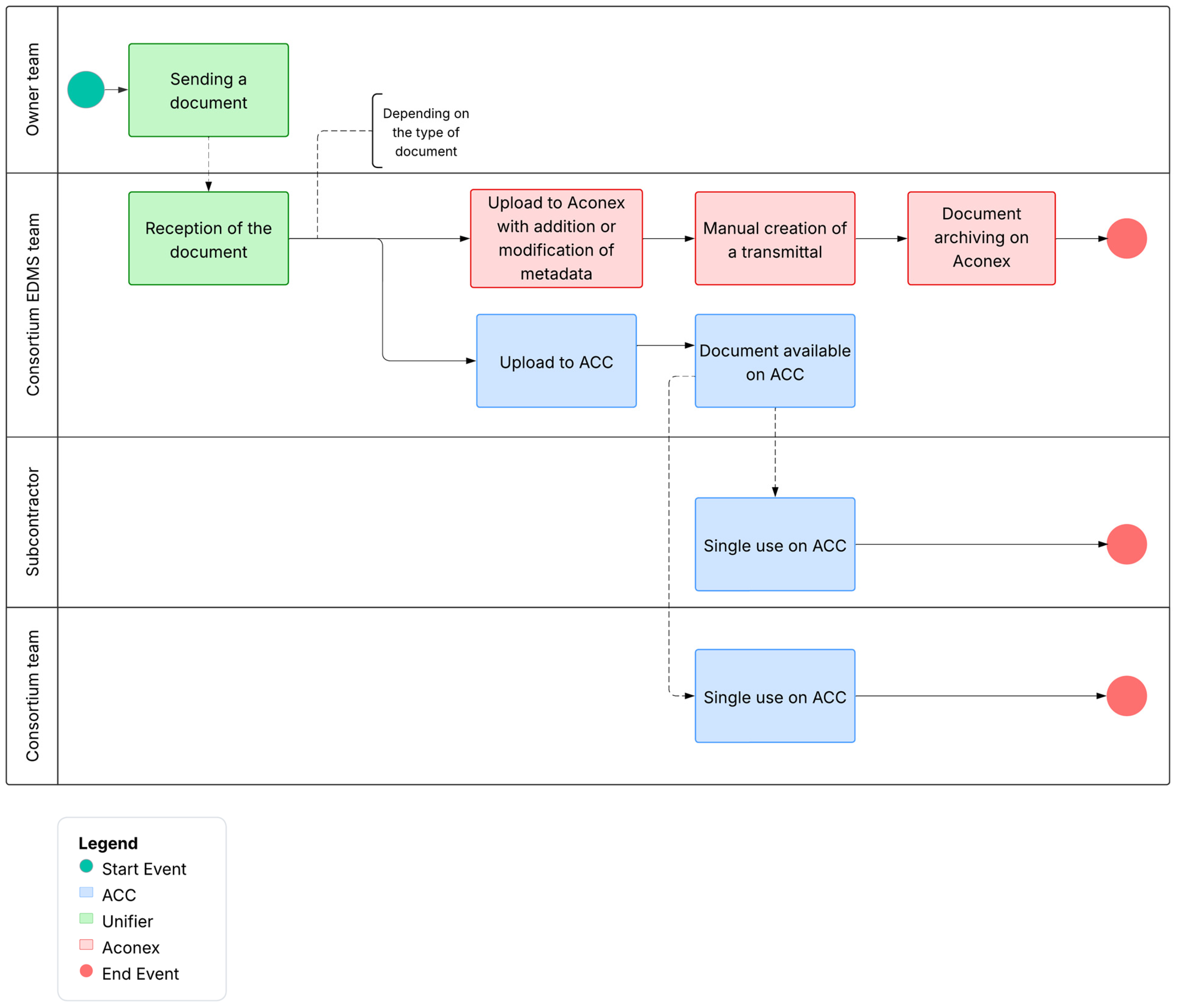 - Parallel and unsynchronized circuits: Although Aconex is intended to be the official platform, the gradual implementation of Unifier by the owner further disrupts the continuity of processes. This adds yet another layer of mandatory manual transfer.