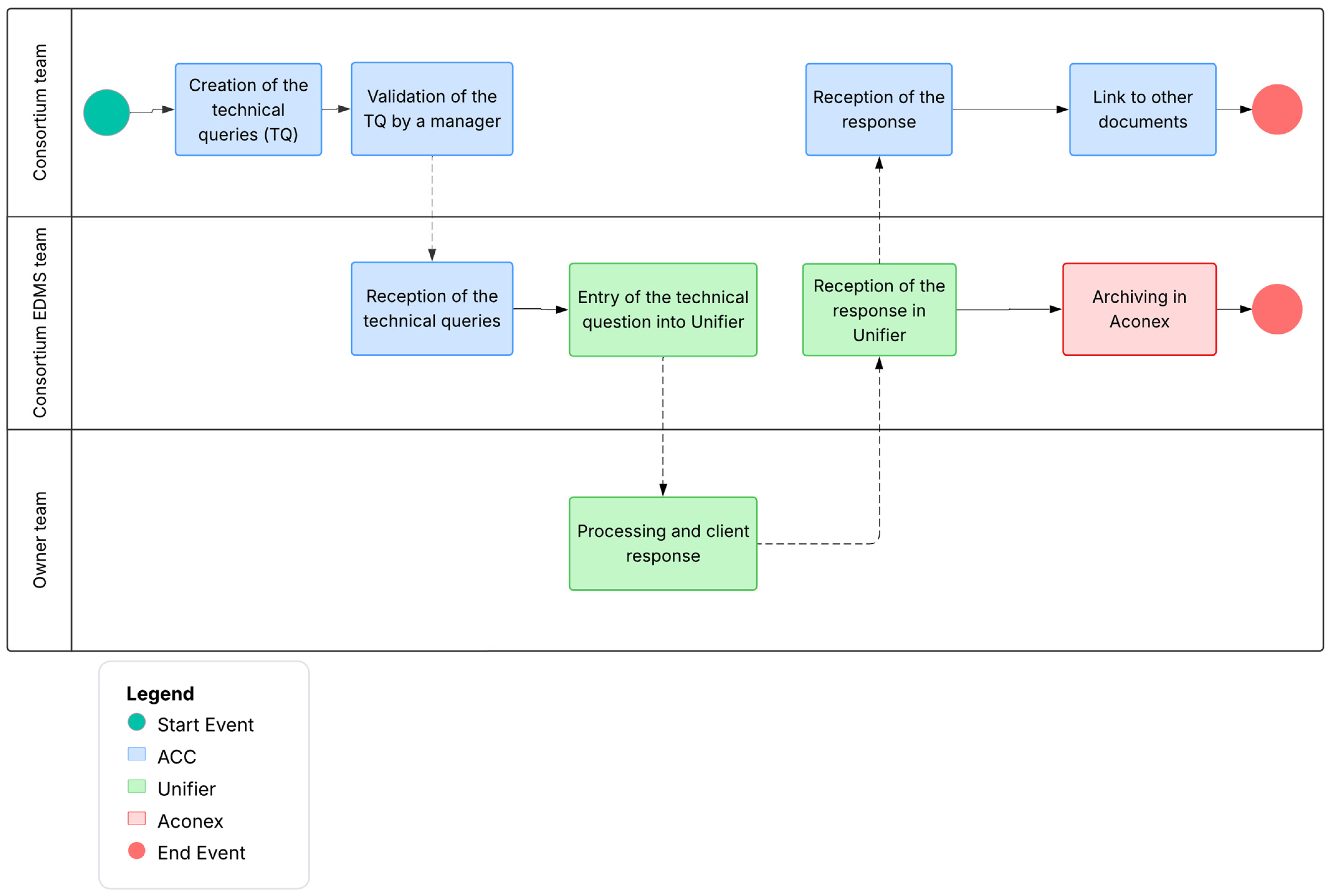 - There was reluctance to change established practices, especially among users who had previously managed TQs via email or shared files. This was exacerbated by the lack of clear directives from the management during the first weeks, which led to a temporary coexistence of the process in both ACC and Aconex. This situation resulted in double entry of Technical Questions and operational confusion.