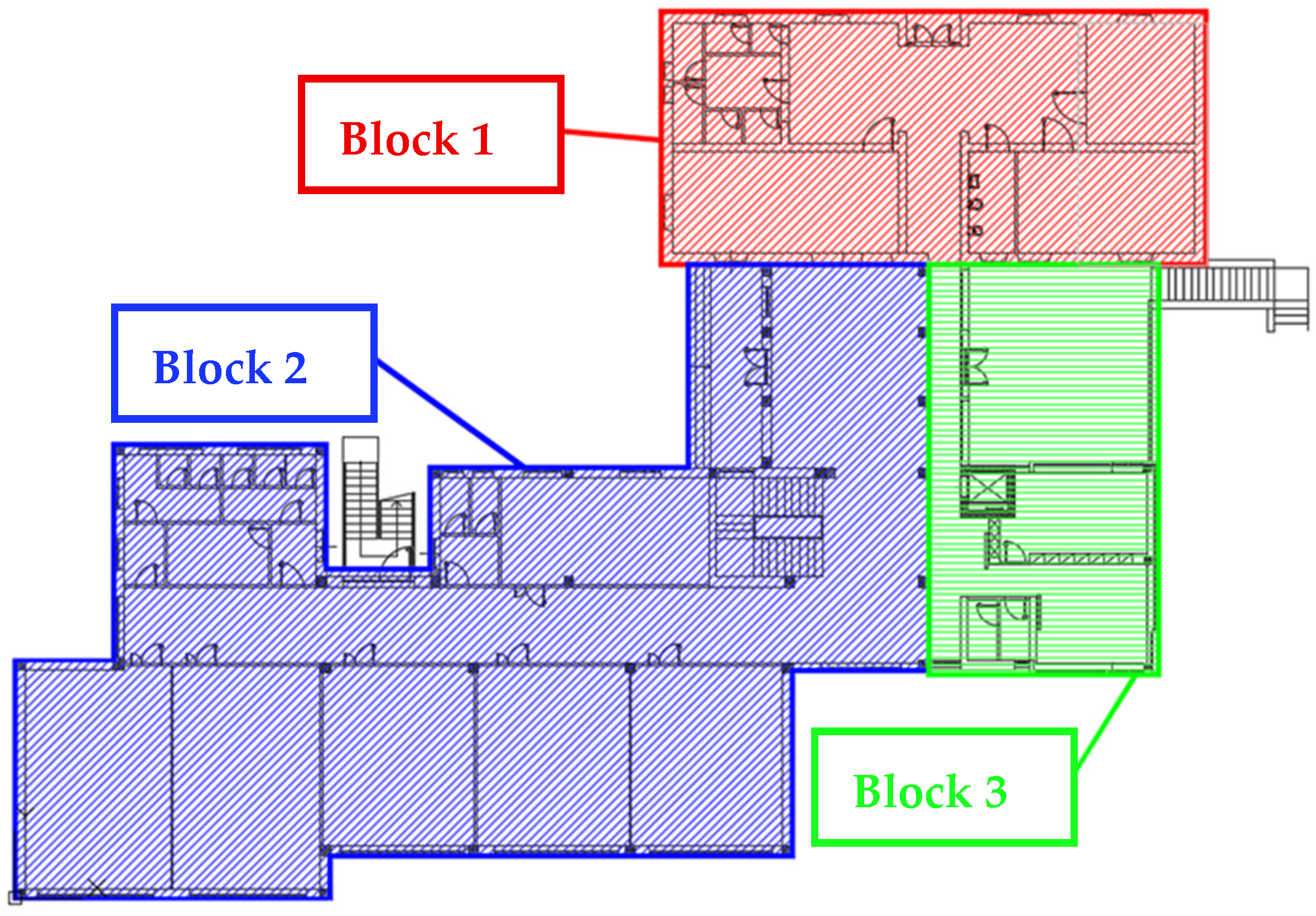 2). Block 3, the most recent addition, employs reinforced concrete frame construction with brick-concrete floor systems across four above-ground levels (approximately 146 m