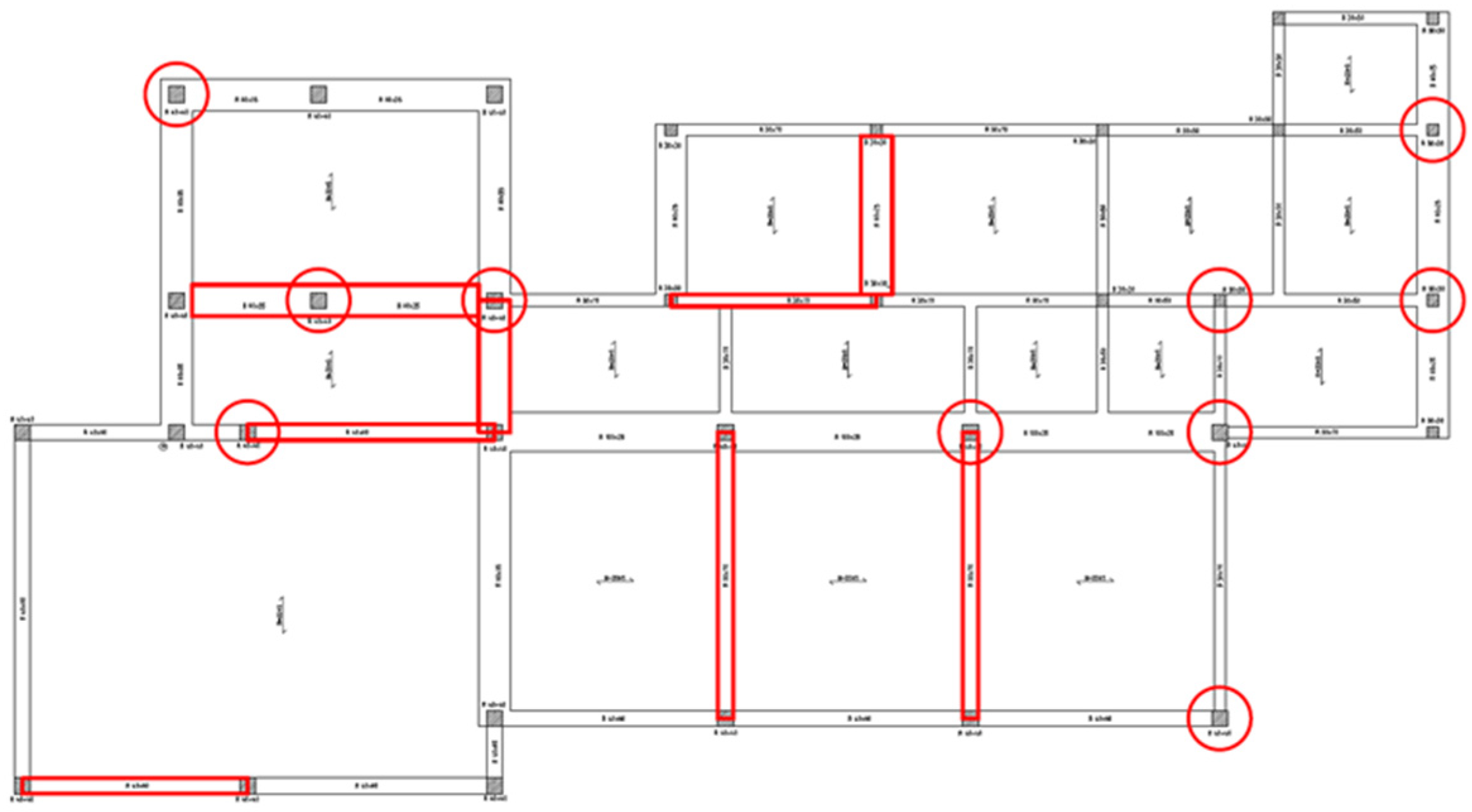 Beam–column joint regions represented the most relevant vulnerability identified in the baseline assessment, with essentially all joints failing to satisfy modern seismic requirements. Joint strengthening employed specialized CAM configurations designed to enhance shear transfer capacity and confinement within the joint core region. The joint CAM applications used larger metallic strips (dimensions adjusted for joint requirements) while maintaining compatibility with the beam and column strengthening systems.