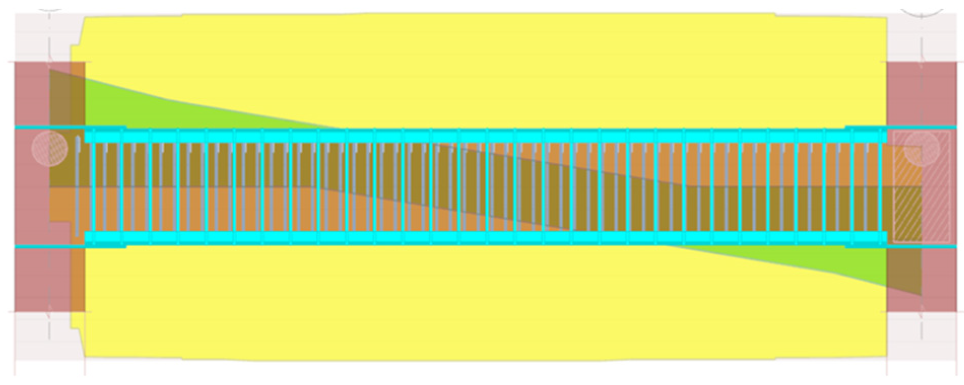 A total of 78 beam elements failed to satisfy strength requirements in the baseline assessment, necessitating targeted strengthening interventions. CAM strengthening for beams employed external application of metallic strips around the beam perimeter, with concrete section enlargement of 50 mm on each side to accommodate the CAM installation and provide enhanced structural capacity. As an example, in