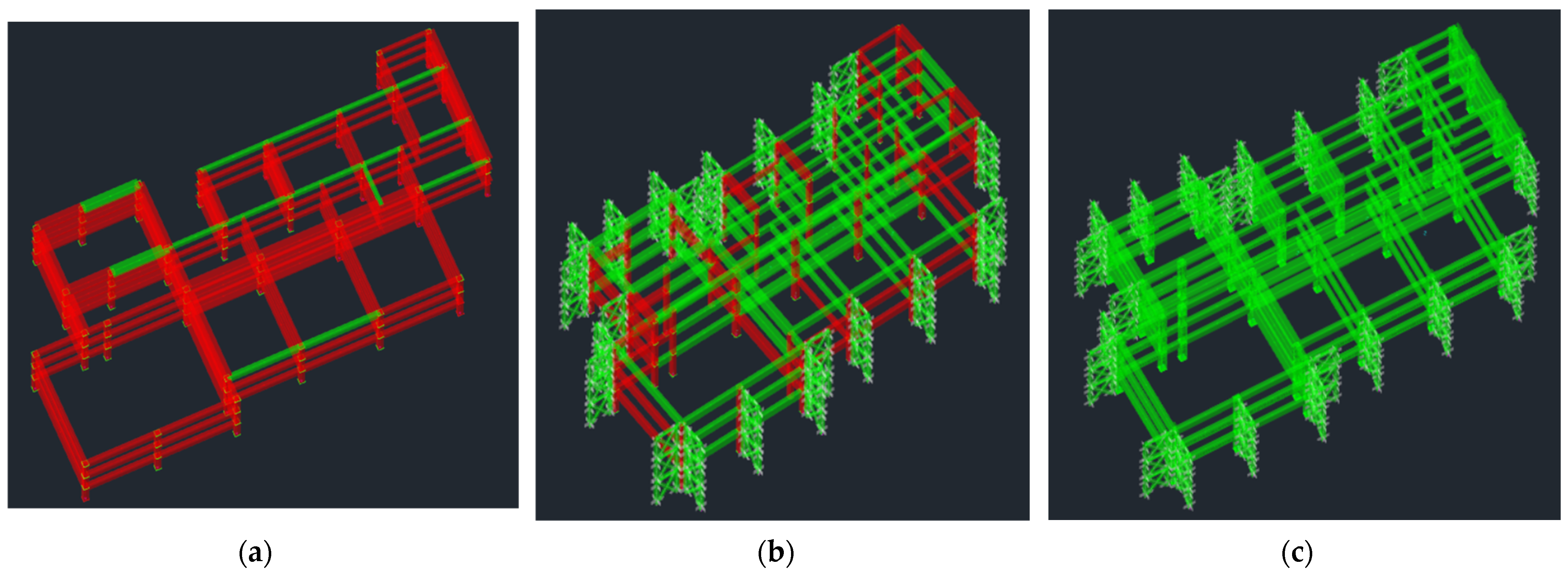 A total of 23 steel exoskeleton units were positioned around the building perimeter, with 9 units along the X-direction and 14 units along the Y-direction. Each perimeter column was connected to at least one exoskeleton unit, with 7 corner columns accommodating connections to two exoskeleton units due to their favorable geometric position. The exoskeleton structures extend over the full three-story height of the building, providing continuous lateral support across all floor levels. The representation of the model with the exoskeleton is also shown in