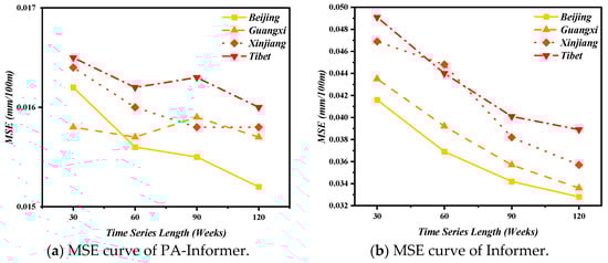 From Figure 9 and Figure 10a, a horizontal comparison of the MSE and R2 values across different models reveals that, except for the MR model, the prediction accuracy of all other models improves as the time-series length increases. The proposed PA-Informer model achieves the best performance, with a maximum MSE of 0.0165 (input window length of 30 weeks) and a minimum MSE of 0.0152 (input window length of 120 weeks) across the datasets. Notably, the MSE variation is less than 8.55%, indicating consistent performance across different time-series lengths.