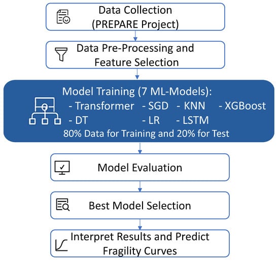 Seven ML models, including K-Nearest Neighbors (kNN), Linear Regression (LR), Stochastic Gradient Descent (SGD), Decision Tree (DT), Long Short-Term Memory (LSTM), Extreme Gradient Boosting (XGBoost), and Transformer architecture, have been employed in this study to predict fragility curves of buildings. The implementation was carried out using Python 3.13.3, leveraging key libraries such as Scikit-learn 1.6.1, Pandas 2.3.1, NumPy 2.2.6, Matplotlib 3.10.3, Seaborn 0.13.2, and Torch 2.7 for data handling, visualization, and model development in a controlled virtual environment to ensure reproducibility. A concise introduction to each model is provided in the following section.