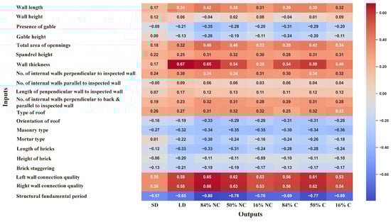 The correlation matrix, as shown in Figure 2, provides valuable and important information on the relationship between building features and the results of seismic fragility curves. It is worth noting that wall thickness and connection quality (Left Connection, Right Connection) exhibit strong positive correlations with most output variables, indicating their critical role in enhancing structural resistance during earthquakes. In contrast, the PGA exhibits a strong negative correlation with fragility thresholds, indicating that buildings with longer periods (typically more flexible) are more susceptible to seismic damage. Moderate correlations were observed for parameters such as the total opening area and the height of the story, suggesting that geometric characteristics also influence structural performance, albeit to a lesser extent. Features such as gable configuration and brick dimensions exhibit low or negligible correlations, suggesting a limited impact on fragility in this dataset. These findings help prioritize features for ML models and emphasize the importance of structural design and dynamic behavior in assessing seismic vulnerability.