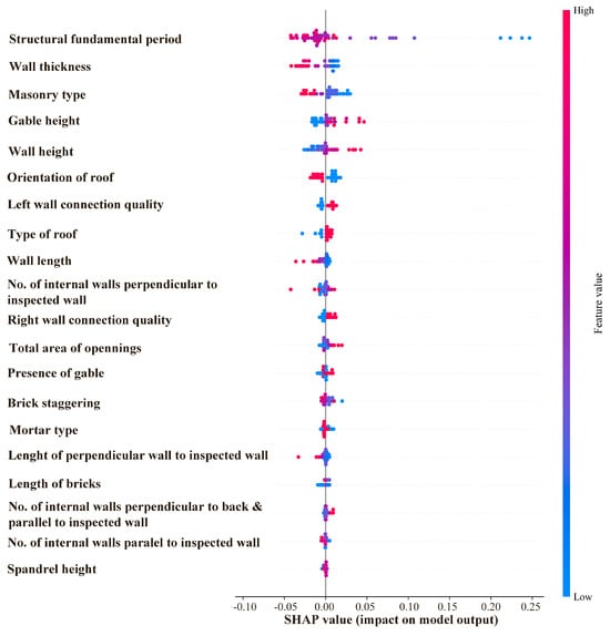 Figure 3 shows the SHAP (SHapley Additive exPlanations) values, which illustrate the relative importance and directional impact of input features on the ML models used for predicting building fragility. The results indicate that the structural fundamental period is the most influential predictor, where higher values (shown in red) are associated with positive SHAP values, thus increasing the probability of higher damage states. Similarly, wall height, masonry type, and gable height contribute strongly to the model’s output, confirming their critical role in seismic vulnerability. Features such as roof orientation, wall thickness, connection quality, and the total area of openings exhibit moderate influence, with their effects varying depending on whether the feature values are high or low. In contrast, brick dimensions, type of mortar, and roof type have minimal SHAP contributions, suggesting a limited role in driving fragility predictions. Overall, the analysis highlights that global structural and geometric parameters significantly influence the prediction process, while localized material properties have a secondary effect. This not only enhances the interpretability of the ML model but also supports targeted seismic assessment and retrofitting strategies by identifying the features most responsible for shifts in fragility curves.