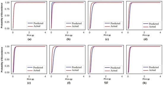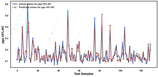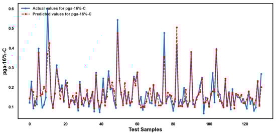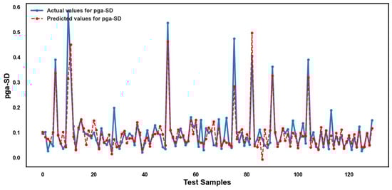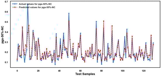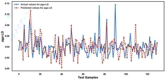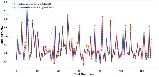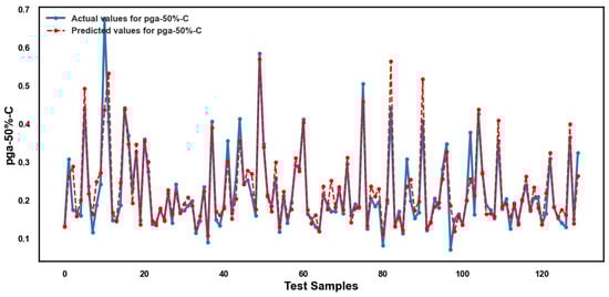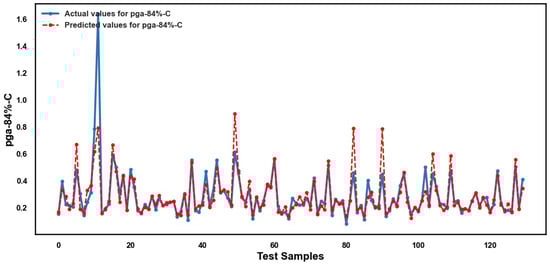 Since the primary focus of this study is on the Transformer model, and to avoid excessive visual content, only the figures for its test data predictions are shown. However, model evaluation metrics for all ML models are presented and discussed to support the analysis. Figure 4, Figure 5, Figure 6, Figure 7, Figure 8, Figure 9, Figure 10 and Figure 11 present the comparison between actual and predicted PGA (g) values in various damage states for test data using the Transformer model. The results indicate that all models demonstrated strong predictive performance, with predictions closely aligned with the observed values. To avoid an excessive number of figures for the training and testing results of different models across each damage state, the corresponding figures for each model are provided in Appendix A (Figure A1, Figure A2, Figure A3, Figure A4, Figure A5, Figure A6, Figure A7, Figure A8, Figure A9, Figure A10, Figure A11, Figure A12 and Figure A13.