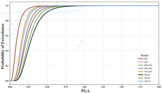 In this study, SPO2IDA [] is used to transform SPO curves into Incremental Dynamic Analysis (IDA) curves. This transformation is based on a validated procedure in which the SPO curve, representing the structural capacity in terms of spectral acceleration versus displacement, is converted into an IDA backbone curve that reflects nonlinear response under a suite of ground motions. Specifically, three IDA curves are obtained, corresponding to the 16th, 50th, and 84th percentiles of the record-to-record variability, which captures the uncertainty in structural response (e.g., FEMA 1997). The spectral acceleration values derived for each limit state are subsequently converted to PGA using a scaling relationship based on the Boore et al. [] ground motion prediction Equation. This approach ensures that PGA adequately captures the structural demand while remaining consistent with widely adopted practices for masonry buildings.