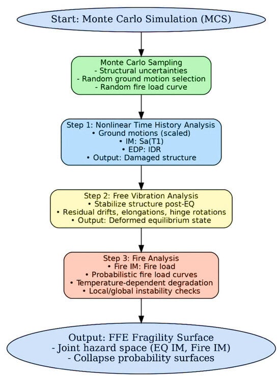 The proposed methodology follows a three-step sequential analysis framework to capture the cascading effects of earthquake and fire on steel MRFs. The framework integrates nonlinear dynamic seismic response, residual deformation transfer, and subsequent fire exposure into a robust procedure for FFE fragility surface generation. Each successive simulation is performed within a Monte Carlo Simulation (MCS) environment, enabling uncertainty quantification and probabilistic estimation of collapse prevention or failure thresholds. The sequential procedure for generating FFE fragility surfaces is summarized in the flowchart shown in Figure 1.