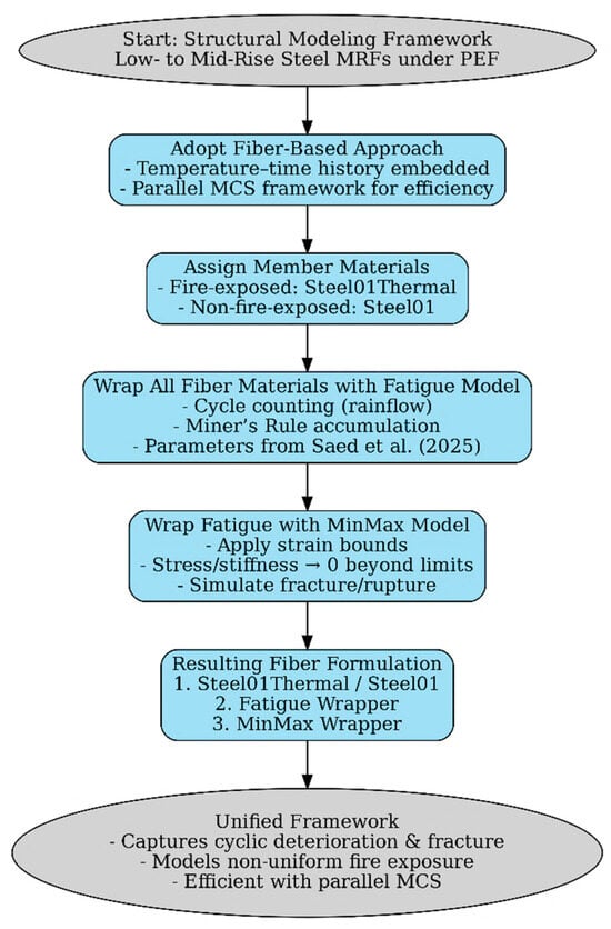 Flowchart of the fiber-based modeling methodology for steel MRFs under post-earthquake fire. The material parameters are based on Saed et al. (2025) [].
