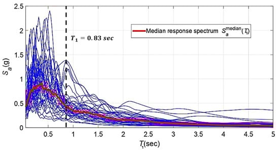 Response spectra of the selected FEMA P-695 [] far-field ground motions (blue lines), with the corresponding median spectrum shown in red. The fundamental period of the case-study building ( s) is marked to illustrate the point-scaling method used for spectral matching.