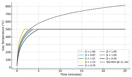 The procedure begins by selecting a fire load value (q), from which the corresponding maximum temperature (Tmax) is obtained using Equation (3). A randomly distributed fire duration (t) is then sampled (as discussed later) to ensure that the ISO-834 curve, expressed in Equation (2), reaches the same Tmax. The variability of the resulting heating trajectories is illustrated in Figure 4, where the ISO-834 formulation is modified by introducing a lognormally distributed β factor multiplied to fire duration, t. This parameter governs the growth rate of the fire curve while preserving its asymptotic behavior. As shown in Figure 4, different realizations of β produce distinct heating curves within the first 25 min, all truncated at 500 °C. The reference ISO-834 curve (β = 1) is also plotted for comparison, demonstrating how the probabilistic treatment captures uncertainty in fire development while remaining consistent with the standardized model.