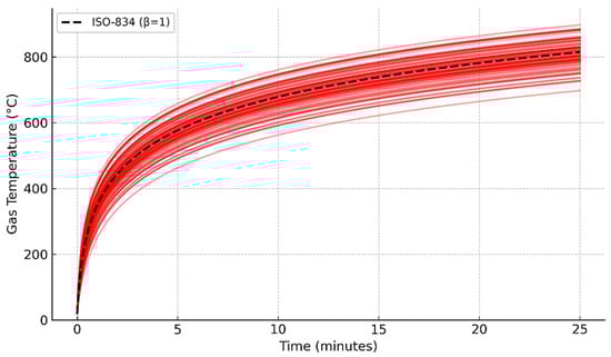 Ensemble of ISO-834 fire curves incorporating uncertainty through a lognormally distributed β factor (red lines). The reference ISO-834 curve (β = 1) is shown in black dashed.