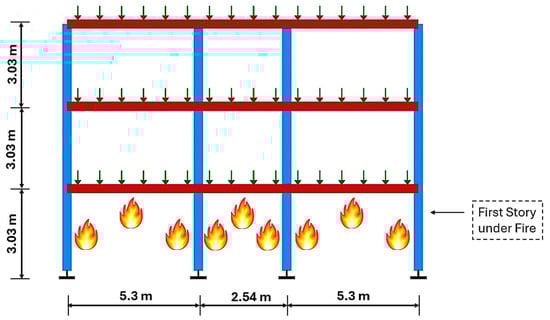 The structure used as an illustrative example is a three-story steel moment-resisting frame representative of a generic office-type building located in a high seismic region of the western United States. The frame is modeled in a two-dimensional (2D) configuration and is adapted from the OpenSeesPy [] example library. As shown in Figure 7, the frame consists of three bays in the horizontal direction, with each story height set at 3.05 m (10 ft). The bay widths vary along the transverse direction—5.3 m, 2.54 m, and 5.3 m—resulting in an overall building width of approximately 13.2 m (43.3 ft). The span length in the longitudinal direction is 4.9 m (16 ft). For stories not exposed to fire, rigid beam–column end connections are enforced using equal degrees-of-freedom constraints to realistically capture joint behavior. In this case study, only the first story is subjected to fire exposure, while the upper stories remain unheated, consistent with the worst-case fire scenario identified in prior studies [,,,,]. However, this uniform heating assumption does not capture localized phenomena such as flame spread or ventilation-controlled burning. In realistic post-earthquake scenarios, partition wall damage can drastically alter ventilation conditions, potentially intensifying fire severity in certain compartments. Therefore, while the adopted modified ISO-834 curve provides computational efficiency and a consistent benchmark, it may underestimate localized thermal effects under realistic ventilation changes, which should be investigated in future studies.