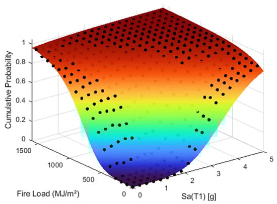 Fire-following-earthquake fragility surface showing cumulative collapse probability as a function of earthquake intensity and fire load; black dots denote simulation data points.