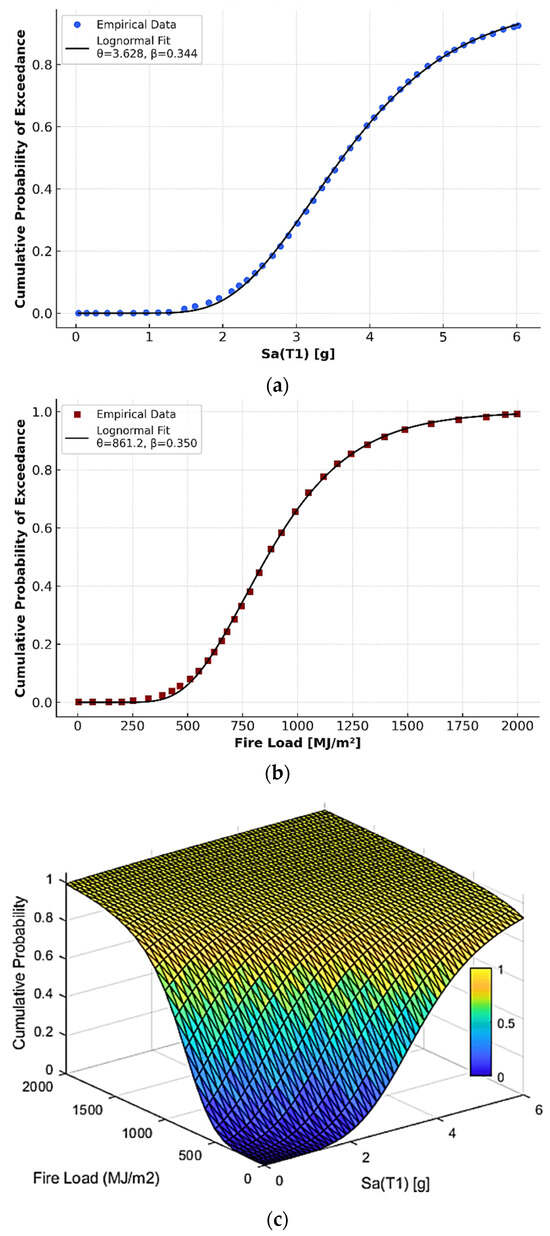 The binary outcome of each run (failure or survival at a given earthquake–fire IM pair) is accumulated across all simulations to calculate the conditional probability of exceeding specified limit states. These raw results are converted into multi-dimensional and multi-hazard FFE fragility surfaces, representing the joint hazard space of earthquake intensity and fire severity. The raw failure probability points can be fitted by a closed-form probabilistic surface function, originally adapted from Harati and van de Lindt (2024a) [], which estimates the conditional exceedance probability for any earthquake–fire IM pair. The surface is expressed as: