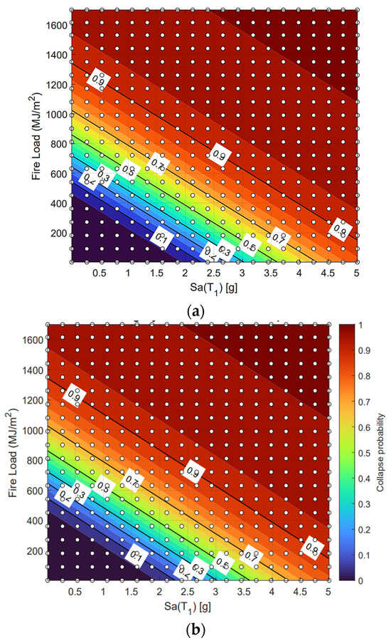 Figure 10 compares the contour representations of the FFE fragility surface, P(DS ∣ IMEQ, IMFire) points, generated from direct successive simulations and the ML-based framework. Figure 10a shows the contour view of the surface obtained through direct analysis, where collapse probability increases smoothly with both earthquake intensity and fire load, and the white contour lines mark probability levels from 0.1 to 0.9. Figure 10b illustrates the contour view of the surface produced by the ML framework using only the boundary fragility curves as input.