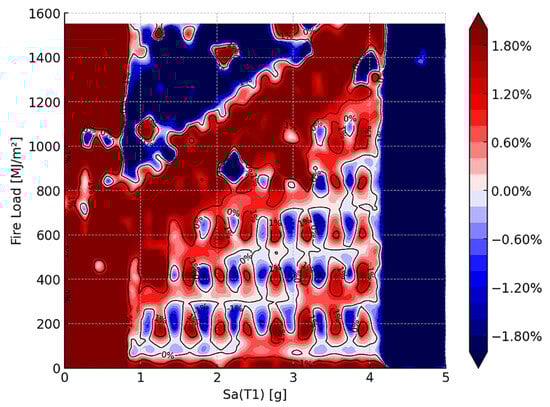 Figure 11 illustrates the difference surface between the ML-based and direct-simulation fragility surfaces, expressed in percentage terms. The contour lines at −1%, 0%, and +1% identify regions of underprediction (blue) and overprediction (red) by the ML framework relative to the benchmark direct-simulation surface. The results indicate that discrepancies remain small across the entire hazard space, generally within ±1%. Localized areas of deviation appear at higher fire load levels combined with moderate seismic intensities, where the ML framework tends to slightly underpredict collapse probabilities. Conversely, minor overprediction is observed at lower fire loads and larger spectral accelerations. Despite these localized differences, the overall agreement is strong, demonstrating that the ML-based framework is able to replicate the direct-simulation surface with high fidelity. Importantly, the ML model achieves this level of accuracy while reducing computational demands significantly, highlighting its suitability for large-scale community-level applications where thousands of hazard scenarios must be evaluated.