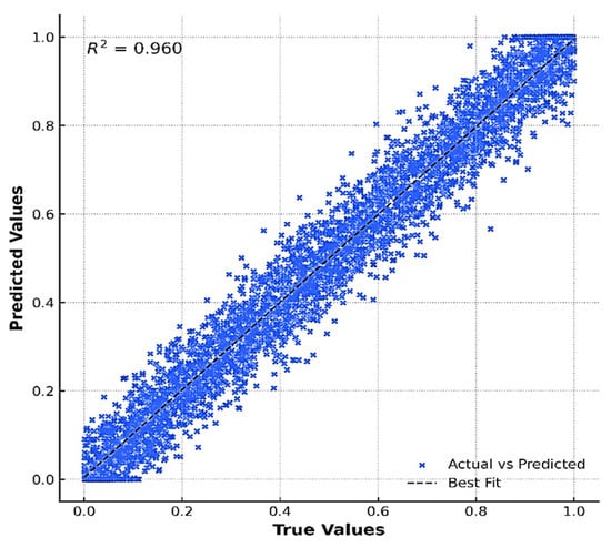 Figure 12 presents a comparison between the ML-predicted fragility values and those obtained from direct simulations (P(DS ∣ IMEQ, IMFire) data points), based on 4000 points sampled from the fitted fragility surface. Each point represents a joint hazard intensity pair of earthquake and fire load, allowing evaluation of model performance across the full multi-hazard domain. The close alignment of the points with the fitted line indicates that the ML framework successfully captures the underlying simulation-based fragility relationships, providing an efficient surrogate for computationally intensive direct analyses. The results demonstrate consistently high predictive accuracy across all cases of joint hazard (IM) values, with R2 values exceeding 0.959 and Root Mean Square Error (RMSE) values remaining below 0.018. Mean Absolute Error (MAE) values also remain low, typically within 0.007–0.011, indicating minimal average error across the fragility domain.
