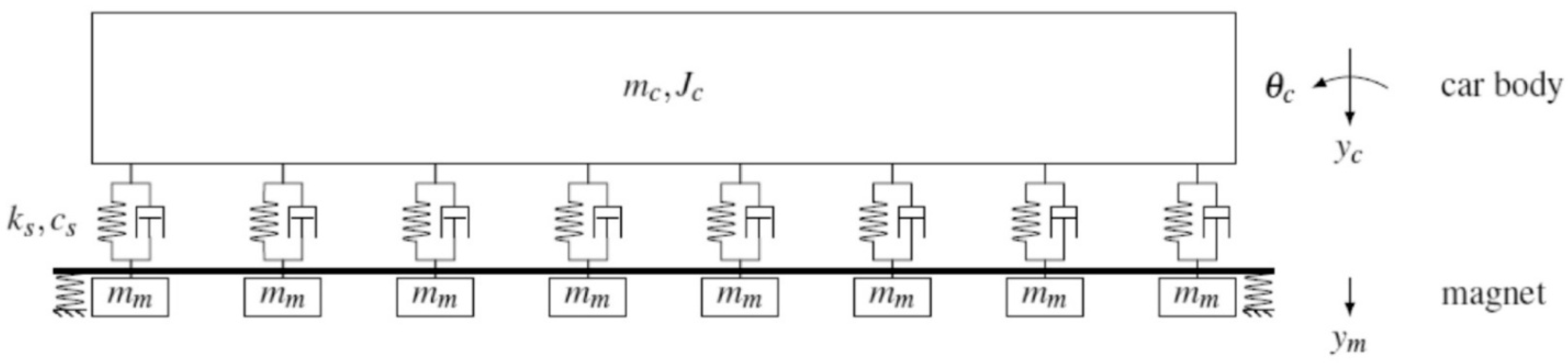 - Liu, Y.; Deng, W.; Gong, P. Dynamics of the bogie of maglev train with distributed magnetic forces. Shock. Vib. 2015, 2015, 896410. [Google Scholar] [CrossRef]