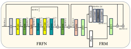 Encoder blocks (EBlock) aim to improve the visibility of indoor concrete wall images under low-light conditions by utilizing Fourier information and adhering to the Metaformer [26] framework. The central structure comprises two main components: a feature refinement feedforward network (FRFN) and a frequency response module (FRM), as illustrated in Figure 2.