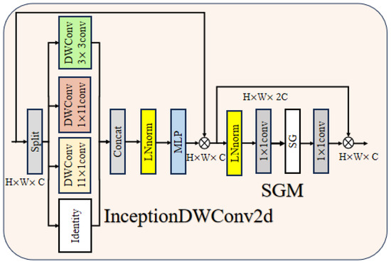 The InceptionDWConv2d module is crafted to capture multi-directional crack features, drawing inspiration from prior studies [11,12] that highlight the significance of extracting multi-directional features for detecting various defect types, such as cracks and spalling. Drawing from the large kernel attention (LKA) mechanism [37] and the Inception architecture [38], InceptionDWConv2d employs multi-branch deep convolution [28] to capture differentiated features. The Inception architecture decomposes a single large kernel into three small kernel deep convolution branches: a 1 × 1 kernel targets the linear continuity of horizontal cracks, another 1 × 1 kernel enhances the edge features of vertical cracks, and a 3 × 3 kernel captures the local texture of diagonal cracks and spalling areas. This approach avoids the over-smoothing of small defects typical of traditional large kernel convolution. Each branch utilizes deep convolution to minimize parameters, incorporating batch normalization and the ReLU activation function to enhance nonlinear feature representation. This method maintains the large receptive field advantage of large kernel convolution while addressing its computational inefficiency. Following multi-branch feature fusion, a simplified channel attention mechanism (SGM) is introduced to dynamically adjust the channel weight in response to the grayscale difference between the crack edge and the background, suppressing redundant responses in the uniform cement wall area. This ensures that defect features are effectively retained across different directions and scales. The calculation process can be expressed as: