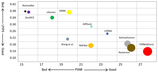 LPIPS, PSNR, and SSIM characteristics of different methods considering the ICLDD dataset. The larger the bubble in the graph is, the greater the SSIM value [18,19,25,27,38,45,46,47,48,49].