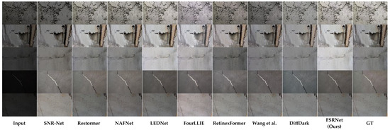 This experiment served as the central verification of this study. The proposed method was evaluated using both quantitative and qualitative assessments on the self-constructed indoor concrete wall low-illuminance defect dataset (ICLDD).