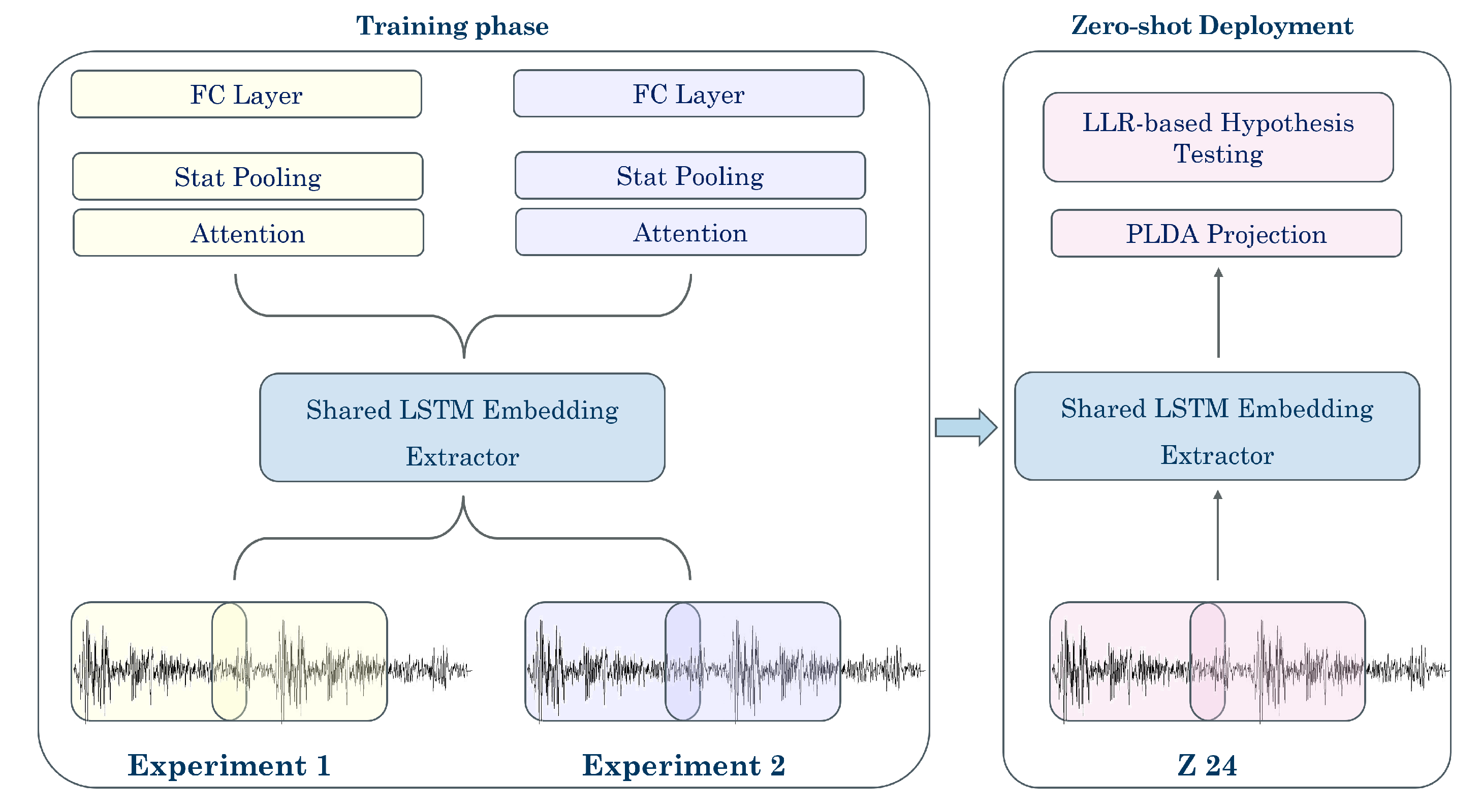 Figure 1 illustrates the overall workflow. During training, sequences from multiple experimental datasets are fed to a shared LSTM backbone that learns generalizable features of structural response, while task-specific heads model dataset-dependent variations. In the zero-shot phase, the trained extractor is frozen and applied to the Z24 Bridge, generating embeddings that are projected into the latent space learned from the laboratory datasets. PLDA scoring is then used to assign class-membership likelihoods and perform novelty detection. By decoupling feature extraction from downstream scoring, the framework can apply a single trained model to unseen structures without additional calibration or retraining.