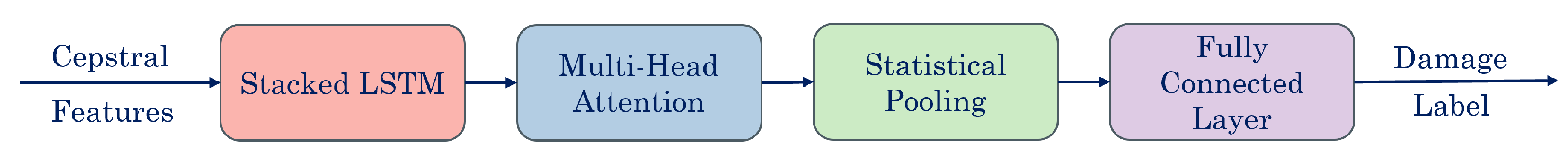 Figure 1. First, signal pre-processing converts raw acceleration time histories into damage-sensitive cepstral coefficients through windowing, frequency-domain transformation, and the discrete cosine transform. Second, LSTM encoding with attention processes the resulting sequence of cepstral feature vectors using a stacked LSTM network that preserves temporal dependencies through state carry-over between overlapping windows. A multi-head attention mechanism emphasizes the most informative portions of the response, and statistical pooling aggregates sequence information into a fixed-length embedding. Third, PLDA-based classification and novelty detection project these embeddings into a latent space where damage states are represented as Gaussian distributions, enabling both supervised classification and zero-shot hypothesis testing without retraining. This modular design allows the LSTM encoder to be trained on laboratory data and subsequently applied directly to unseen structures through the PLDA back-end.