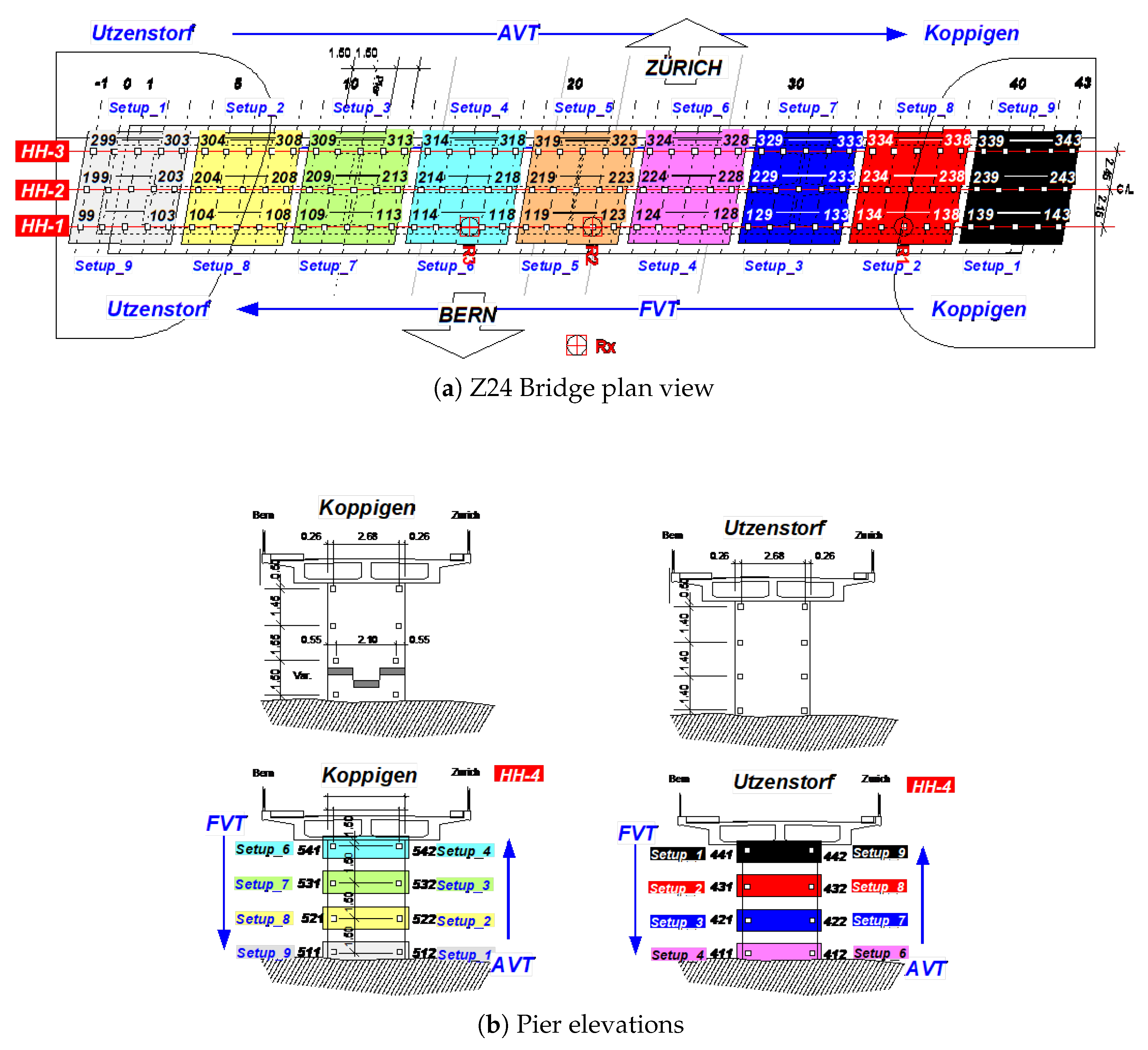 27] serves as the experimental dataset validation. This pre-stressed concrete box-girder bridge in Switzerland was instrumented before its demolition to create a unique, large-scale dataset. The Progressive Damage Test (PDT) documents 17 systematically induced damage states, including pier settlements, spalling of concrete, tendon ruptures, and hinge failures, measured by a grid of accelerometers across the spans and piers. The damages are summarized in