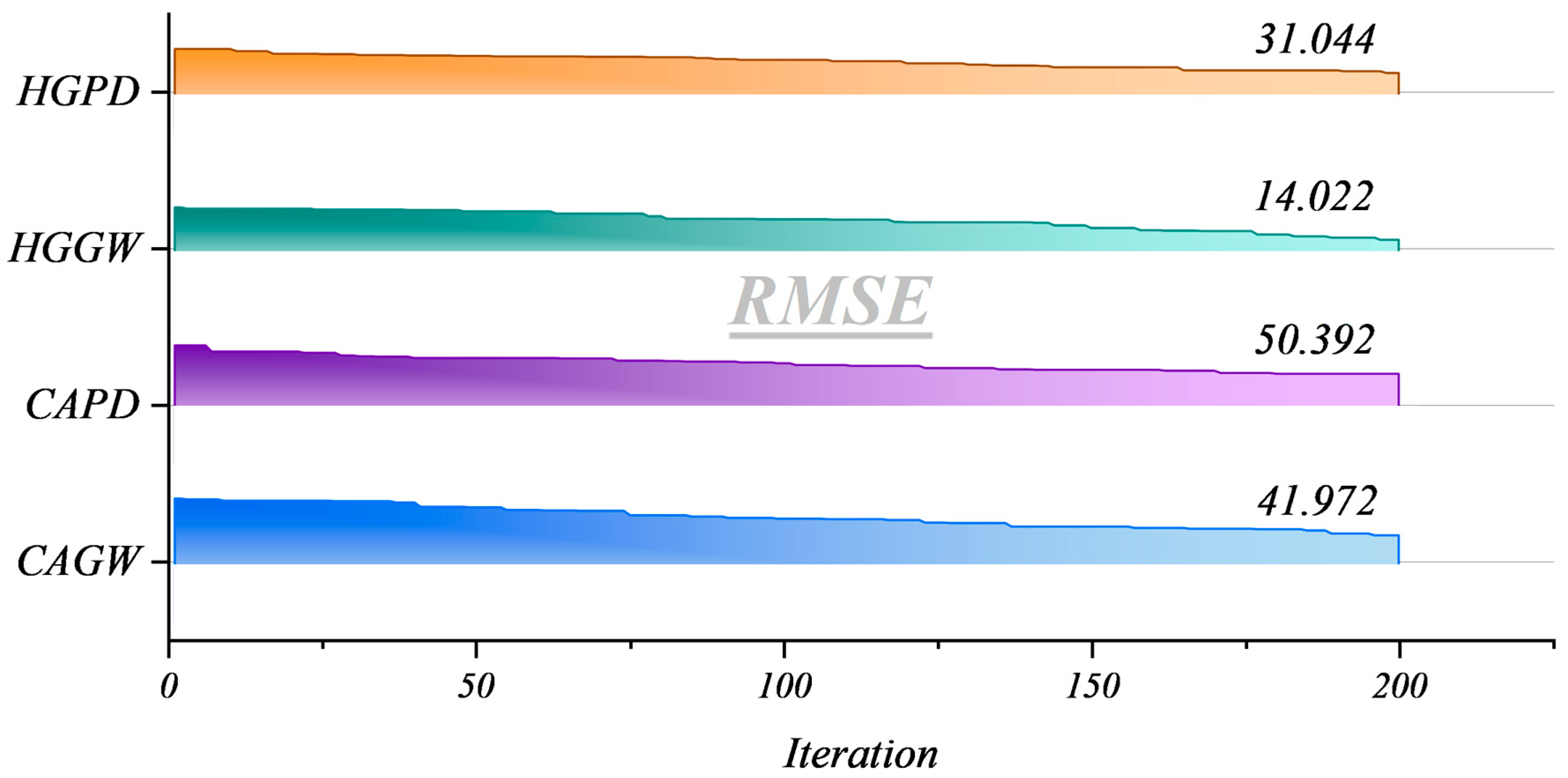 Figure 4 illustrates the RMSE optimization trajectories for the four predictive models (CAPD, CAGW, HGPD, and HGGW) over 200 algorithmic iterations. Each curve represents a single deterministic optimization process rather than multiple independent runs. During each optimization, a population of 30 individuals was initialized, and the process converged after 200 iterations. To ensure stability, three independent optimization rounds were executed, and the trajectory with the best performance was selected for presentation. Among the models, the HGGW framework achieved the lowest RMSE (14.02), demonstrating superior convergence and predictive stability.