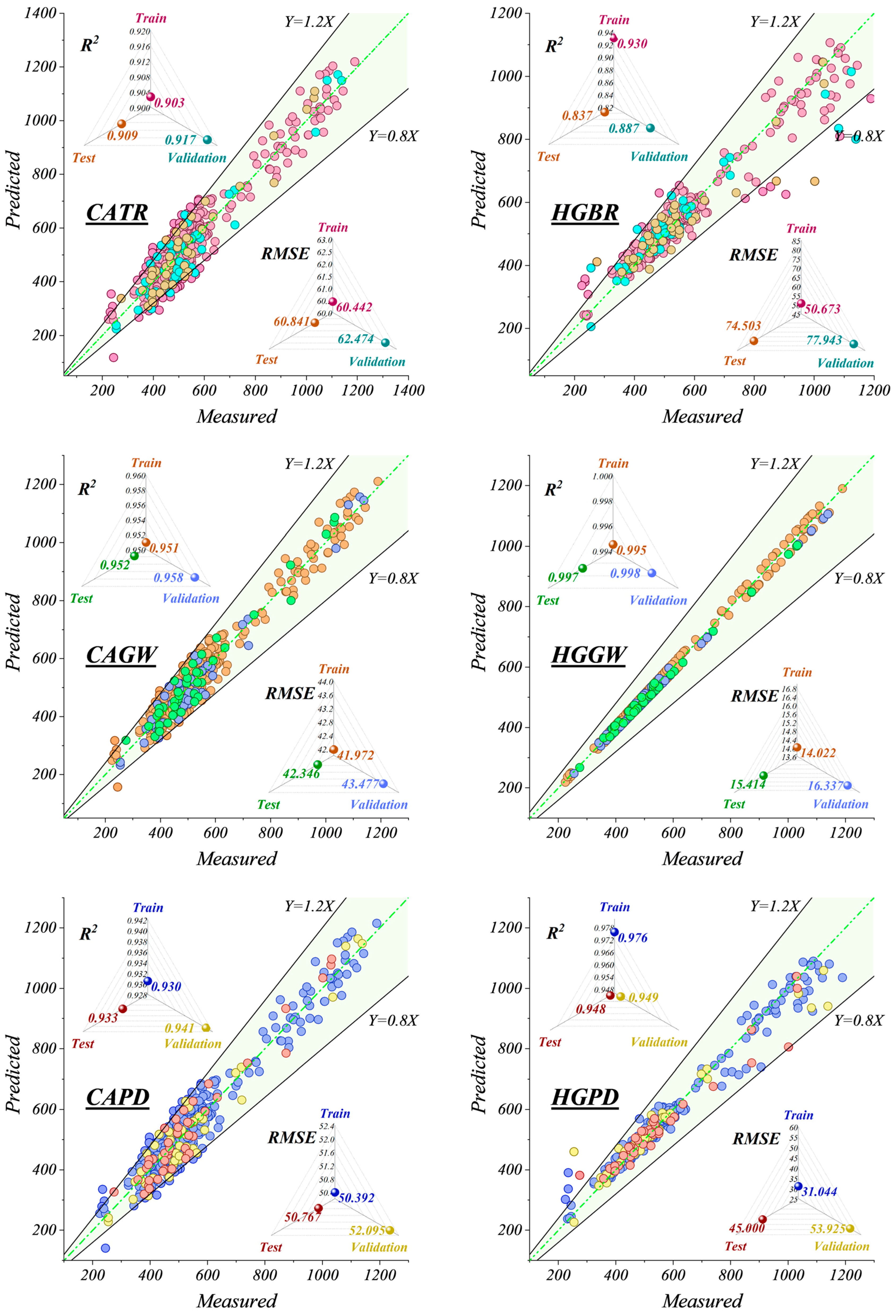 2 (as 0.837 and 0.903) and higher RMSE (up to 74.50 and 62.47), indicating more divergence from measured values. The region shaded out between Y = 0.8X and Y = 1.2X is an acceptable prediction zone. The performance indicates that HGGW is superior to others and is the most general and ideal model for performing the work.