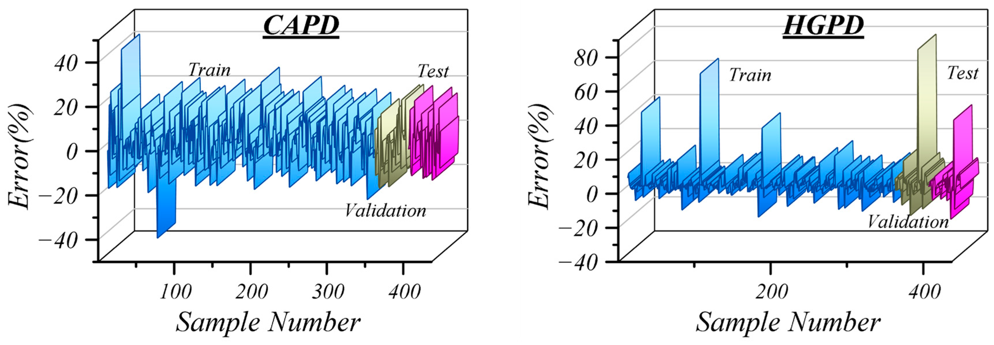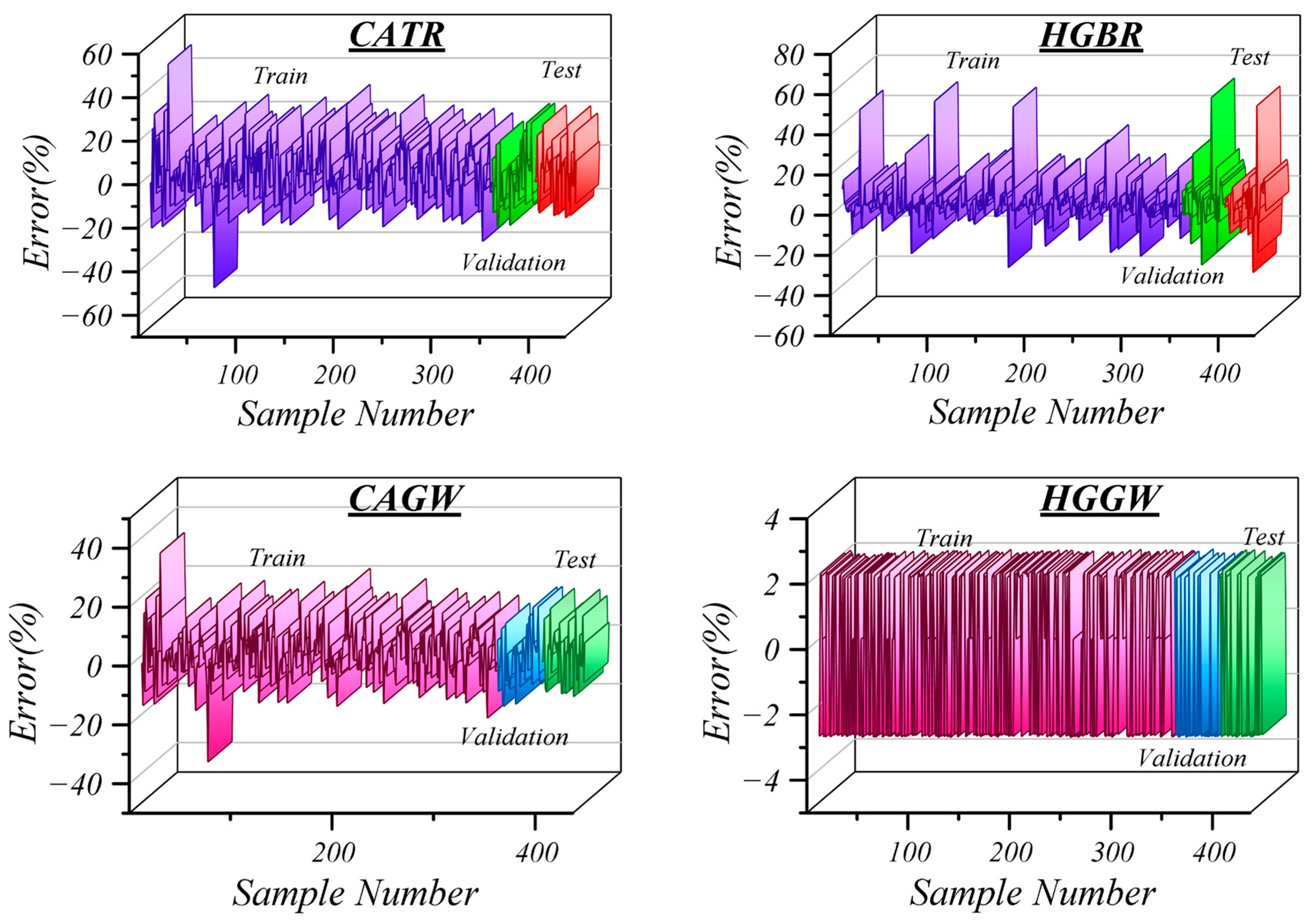 Figure 6 clearly shows the distribution of error in six intelligent modeling approaches in predicting steel’s fatigue life during training, validation, and testing periods. The error in the HGB model is extremely volatile, with up to ±60%, presenting it with a lack of stability, high sensitivity to changes in inputs, and poor generalization to novel data points. The same is true for the CAT model, which exhibits high error variation during its training period, thereby exposing its shortcomings in modeling noise and nonlinear fatigue data. In contrast, HGGW, CAGW, and CAPD models exhibit superior stability and accuracy. HGGW is particularly good with errors confined to a small ±4% margin in all phases, indicating high prediction accuracy and strong generalizability. CAGW with errors below ±30% was found to have better stability and reliability of forecasts than the baselines. CAPD also demonstrates a similar performance with less fluctuation during the test phase, thus having more stability. Still, HGPD is on average limited and characterizes test errors that exceed 80%, which suggests the presence of overfitting or the incapability of adapting to new inputs. These outcomes disclose the potential of hybrid and adaptive modeling methods. The operations like HGGW, CAGW, and CAPD have a significant effect on performance and generalization of the solution of complex fatigue cases. Such upgrades become especially relevant in the real-world scenario where the safety margin is low and the failure risk is high; therefore, these models can be considered as reliable and trustworthy tools for monitoring metal structural fatigue life.
