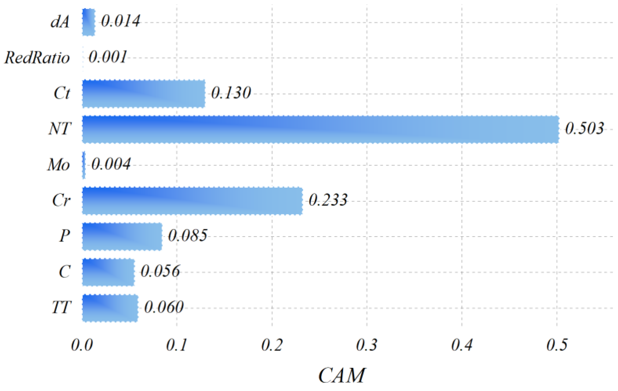 To further ensure reliability, potential multicollinearity among metallurgical variables (e.g., Ni, Cr, Mo) was analyzed during pre-processing, and redundant inputs were minimized through normalization and correlation screening. Consequently, the variations between CAM and SHAP rankings stem solely from methodological differences rather than dataset inconsistencies. While both approaches offer valuable insights, SHAP provides the more comprehensive interpretive framework for this study, as it captures nonlinear dependencies and feature interactions intrinsic to the hybrid boosting models. CAM serves as a complementary tool to visualize global linear trends and to cross-validate feature relevance.