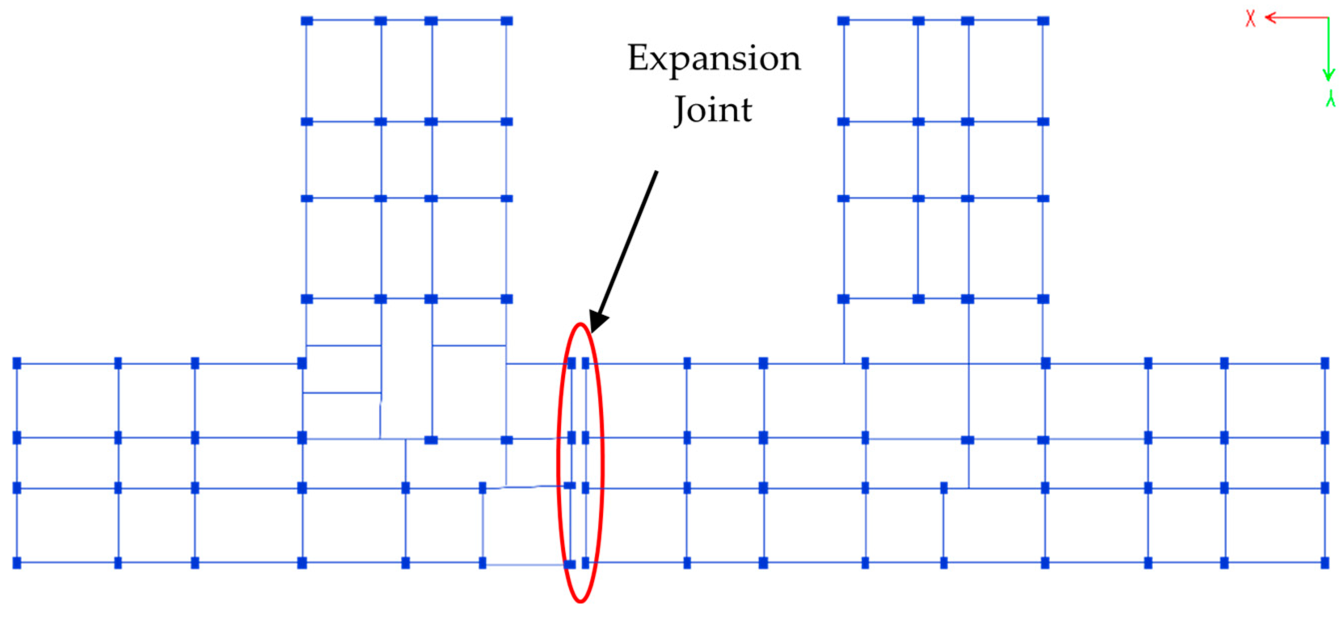 Figure 1. Each block is modelled as a separate entity via identical parameters, including the number of stories, structural layout, and loading conditions. This division ensures that the influence of expansion joints is realistically incorporated into the analysis.