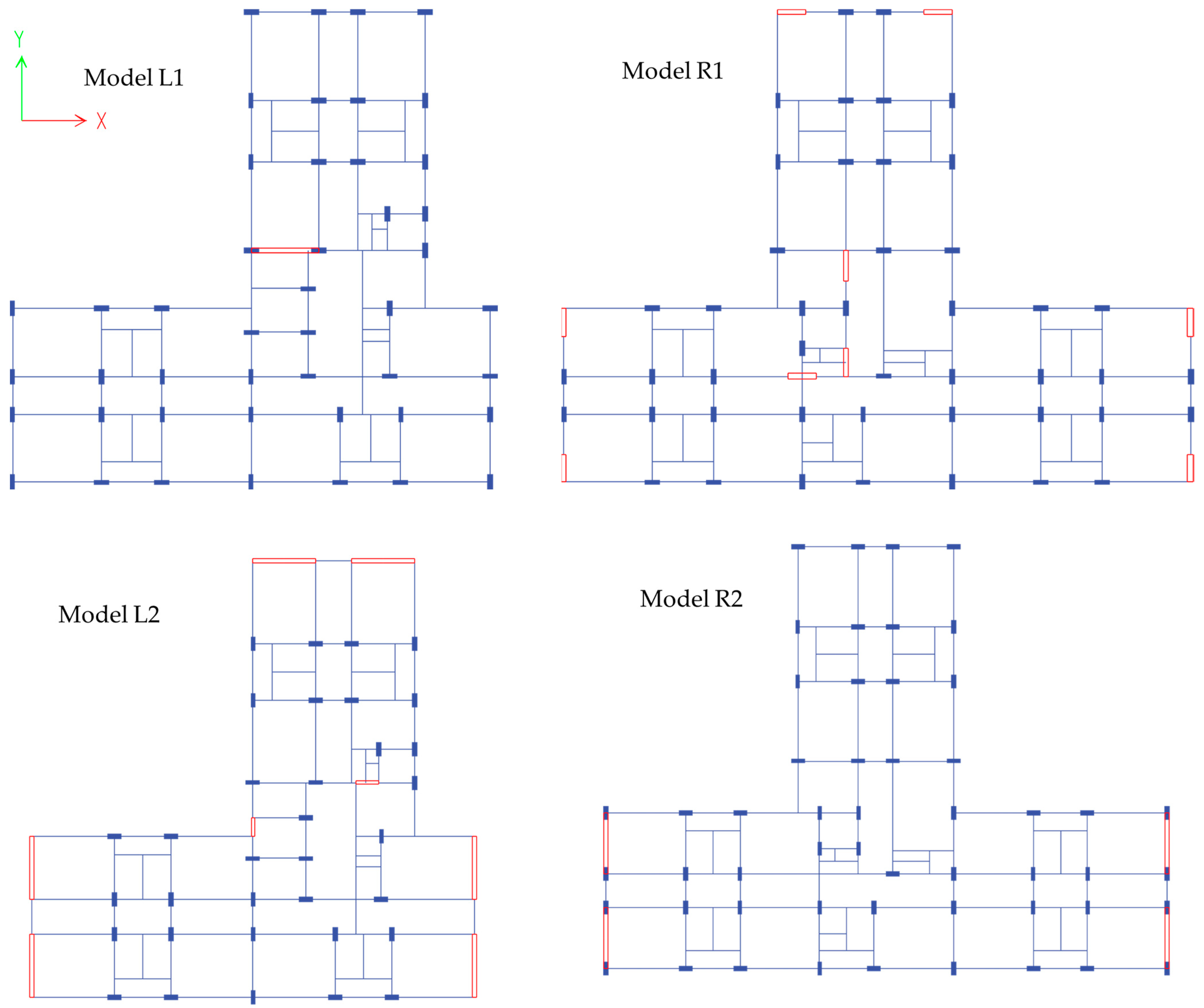 Based on the statistical analysis, it can be observed that Model L4, corresponding to the left block, and Model R5, corresponding to the right block, result in a superior seismic performance when compared to the other shear wall configuration models. The improved performance can be attributed to the higher modal mass participation factors, as shown in