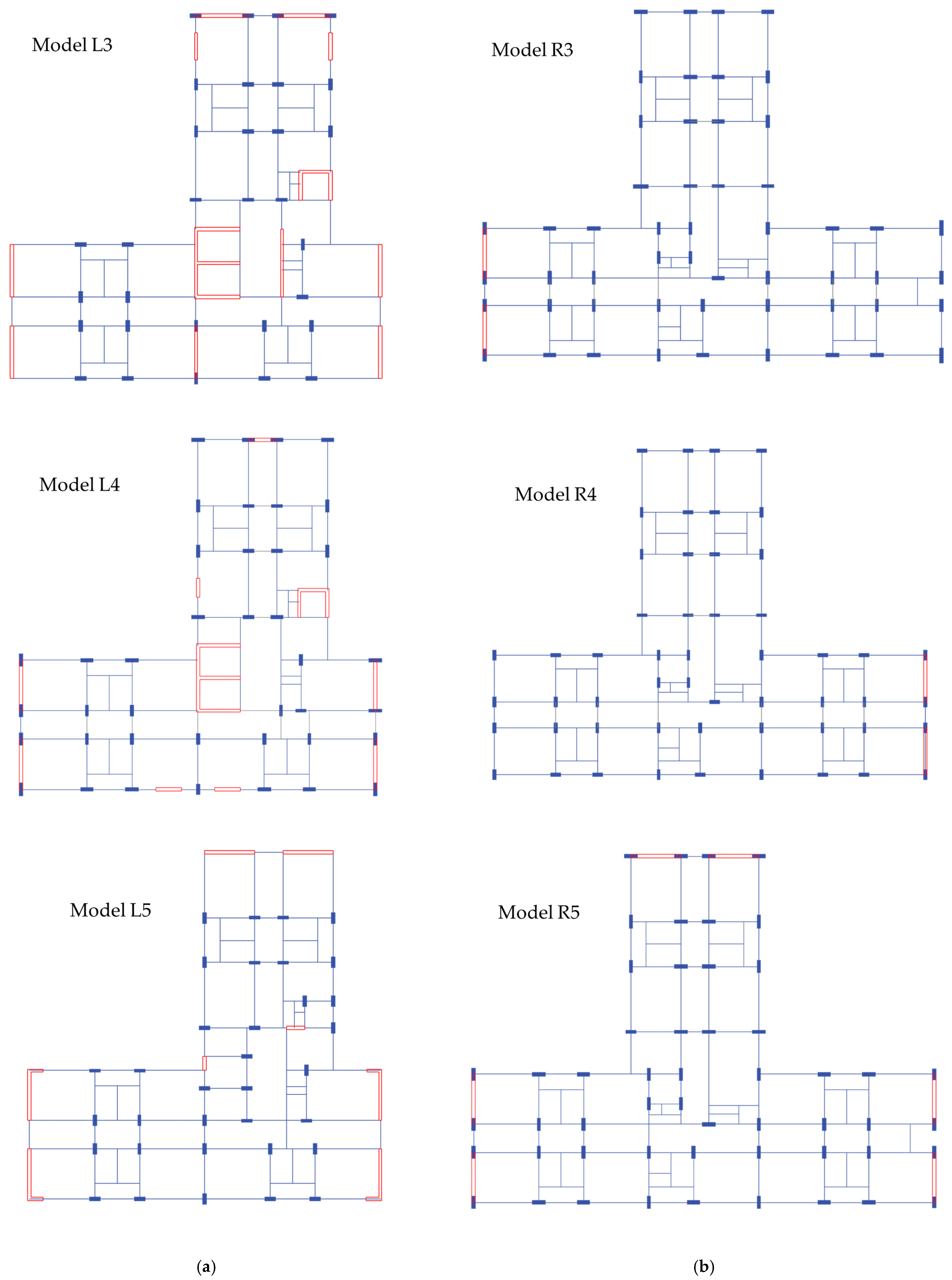 Figure 3. Five different configurations are considered for each block, i.e., left and right blocks separately. In the figures, the shear wall locations are indicated with red-coloured blocks.