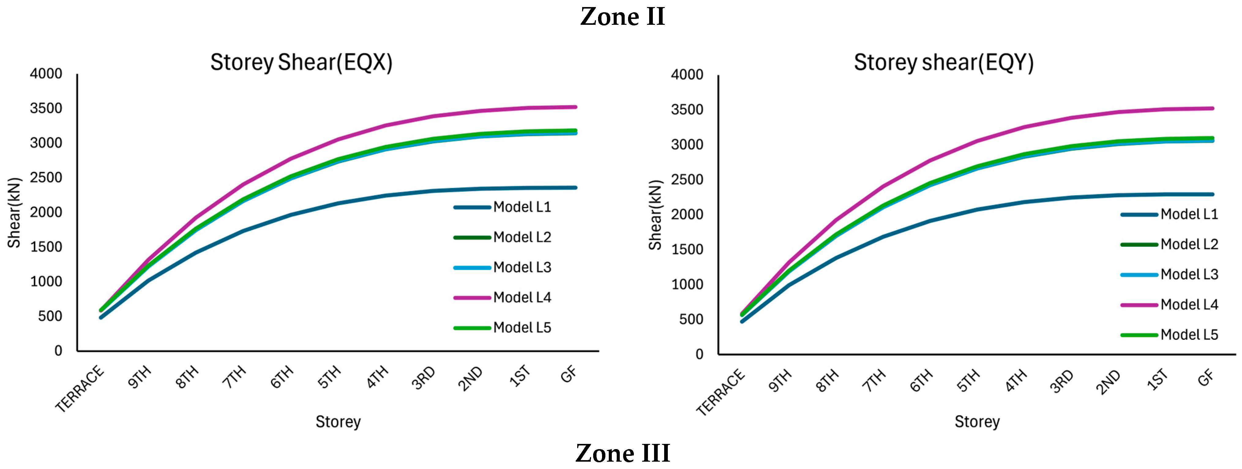 Figure 4. These responses correspond to five different shear wall configurations under earthquakes along the X-direction (EQX) and along the Y-direction (EQY). In all the cases, the storey shear increased from the terrace level to the ground floor due to the cumulative effect of seismic forces. The shear at the ground floor (GF) level represents the cumulative shear at the base of the structure, commonly referred to as base shear. The base shear is an important parameter considered in the design of buildings. The size of the columns required and the amount of reinforcement needed for the structure depend on the base shear. The higher the base shear, the larger the column and the reinforcements. It can be seen from the figure that Model L4 consistently exhibited the highest base shear, indicating superior lateral stiffness, whereas Model L1 presented the lowest base shear due to inadequate shear walls. It may be noted that the larger base shear indicates that most of the earthquake forces are resisted by Model L4 rather than the other models. When the responses under various seismic zones were compared, the base shear demand increased significantly with the zone factor, and the maximum base shear in Zone II was approximately 3500 kN in the EQX direction, which increased to 5500 kN in Zone III and nearly 8500 kN in Zone IV, reflecting a relatively high seismic intensity. A similar trend was observed in the EQY direction, although slightly lower values were recorded, indicating some directional stiffness irregularity in the structure. However, optimised shear wall placement reduced this directional difference, improving torsional balance. Compared with Model L1, Models L2, L3, and L5 resulted in moderate improvements in base shear, whereas Model 4 resulted in the largest base shear in comparison with the other models, highlighting that the location of shear walls significantly influences the modal mass participation and overall seismic response. The lower shear in the case of Model L1 is due to the low stiffness offered by the shear walls. The results clearly demonstrate that strategic optimisation of shear wall locations enhances structural performance under seismic loading, especially in higher seismic zones, where lateral forces are more critical.