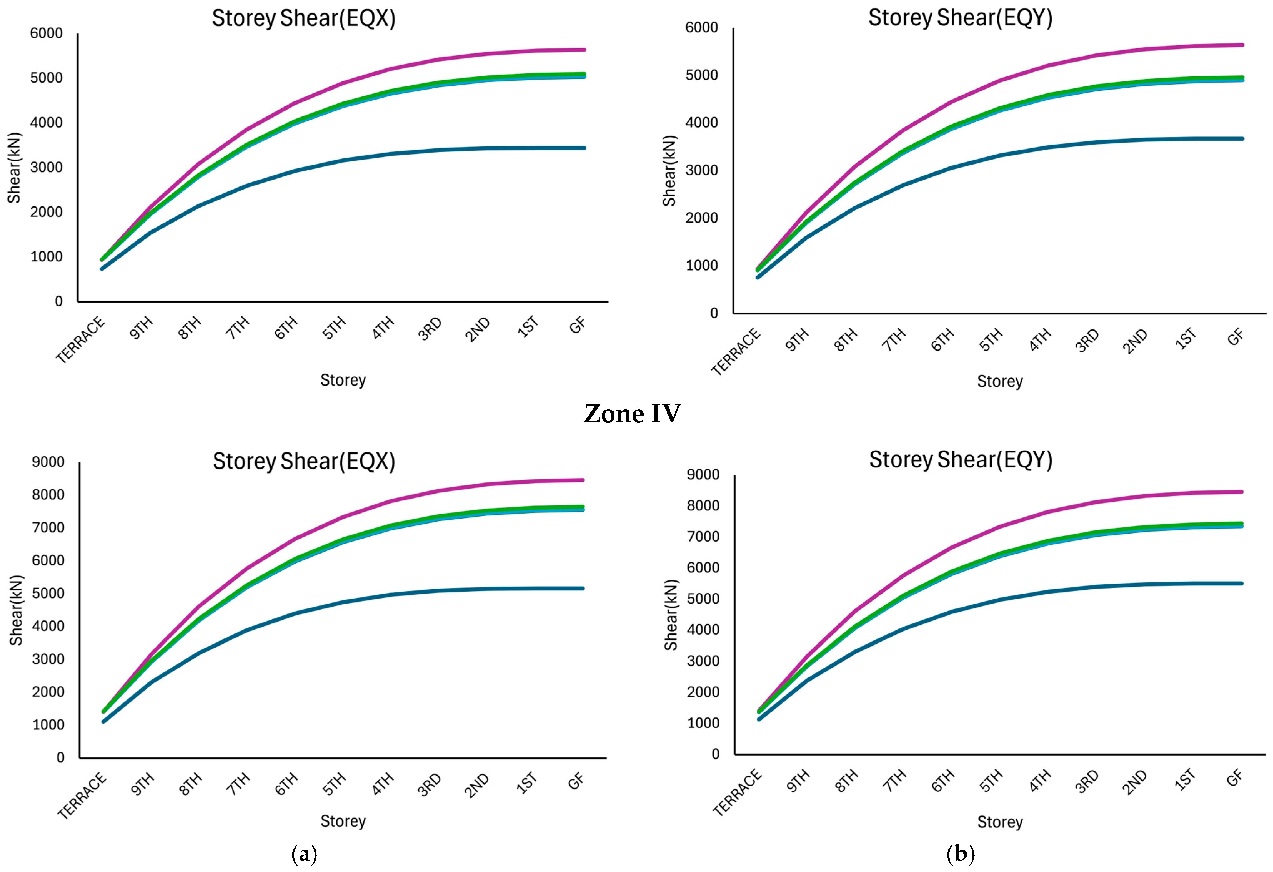 Across seismic zones, an apparent increase in base shear demand was observed with an increasing zone factor. For example, in the EQX direction, the maximum base shear at the terrace level was approximately 4200 kN in Zone II, which increased to approximately 7000 kN in Zone III and further increased to nearly 10,000 kN in Zone IV, reflecting the higher seismic intensity in more critical zones. A similar trend was observed in the EQY direction, with slightly lower values resulting from directional stiffness irregularities in the structure. As can be seen from
