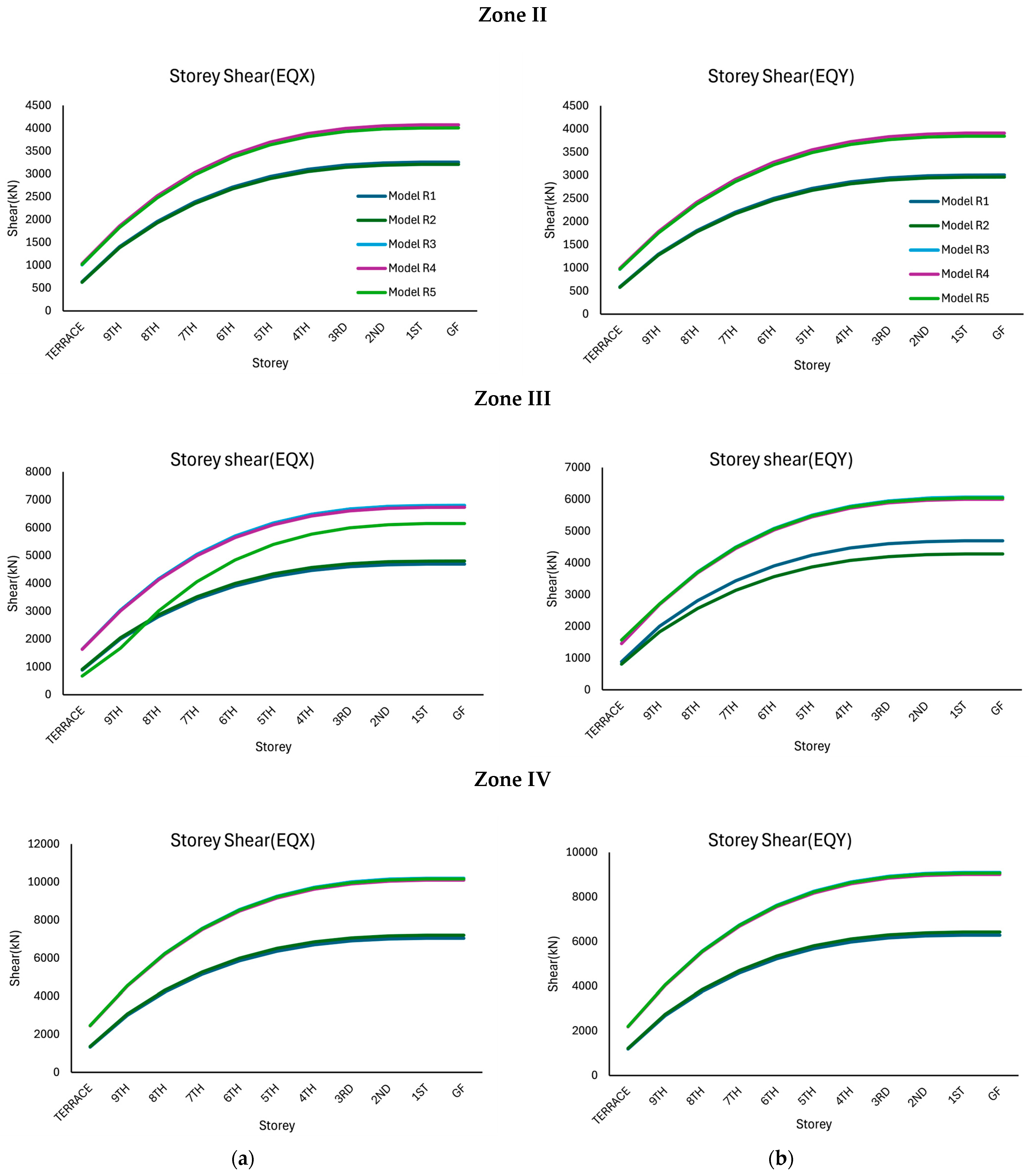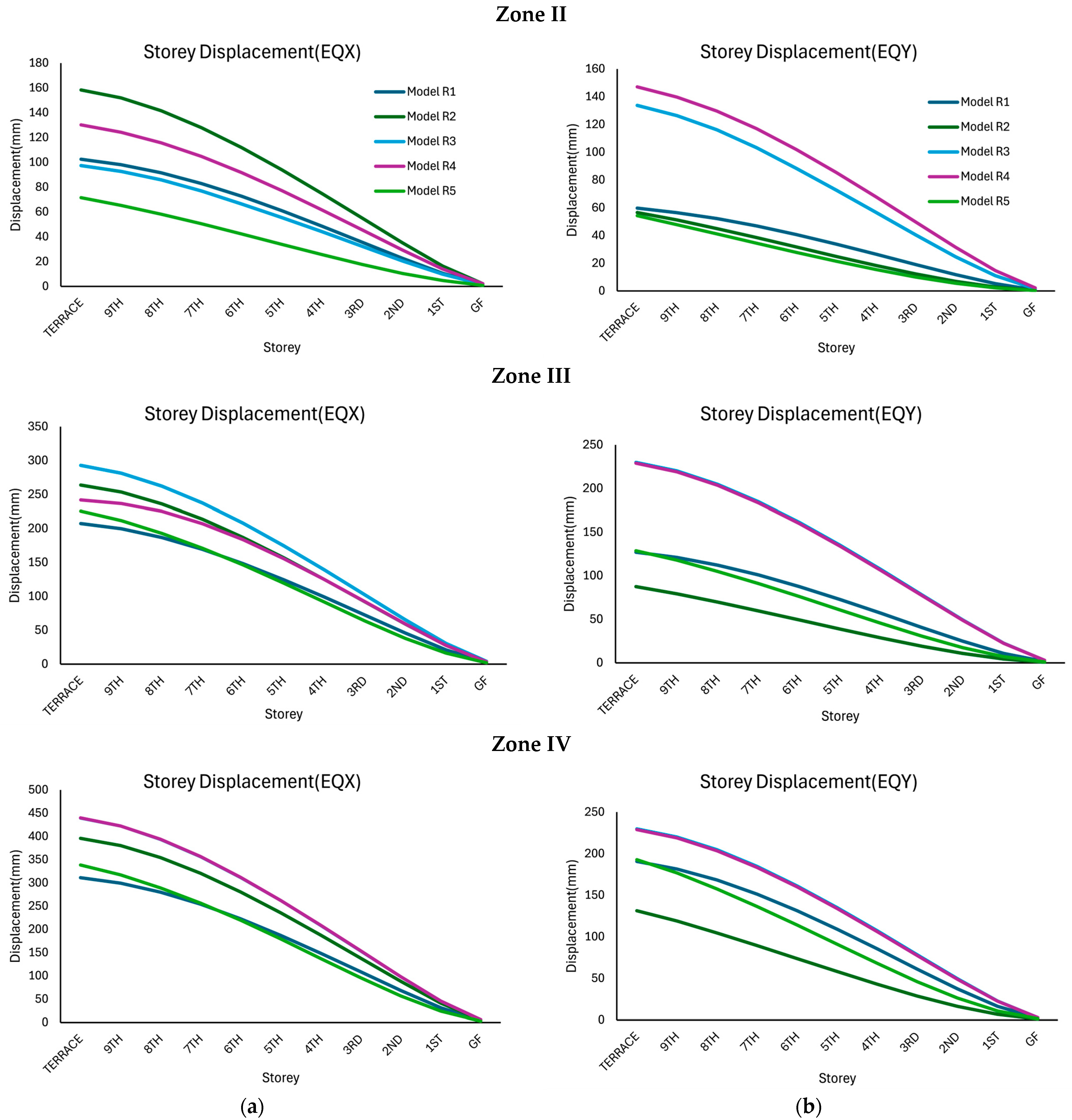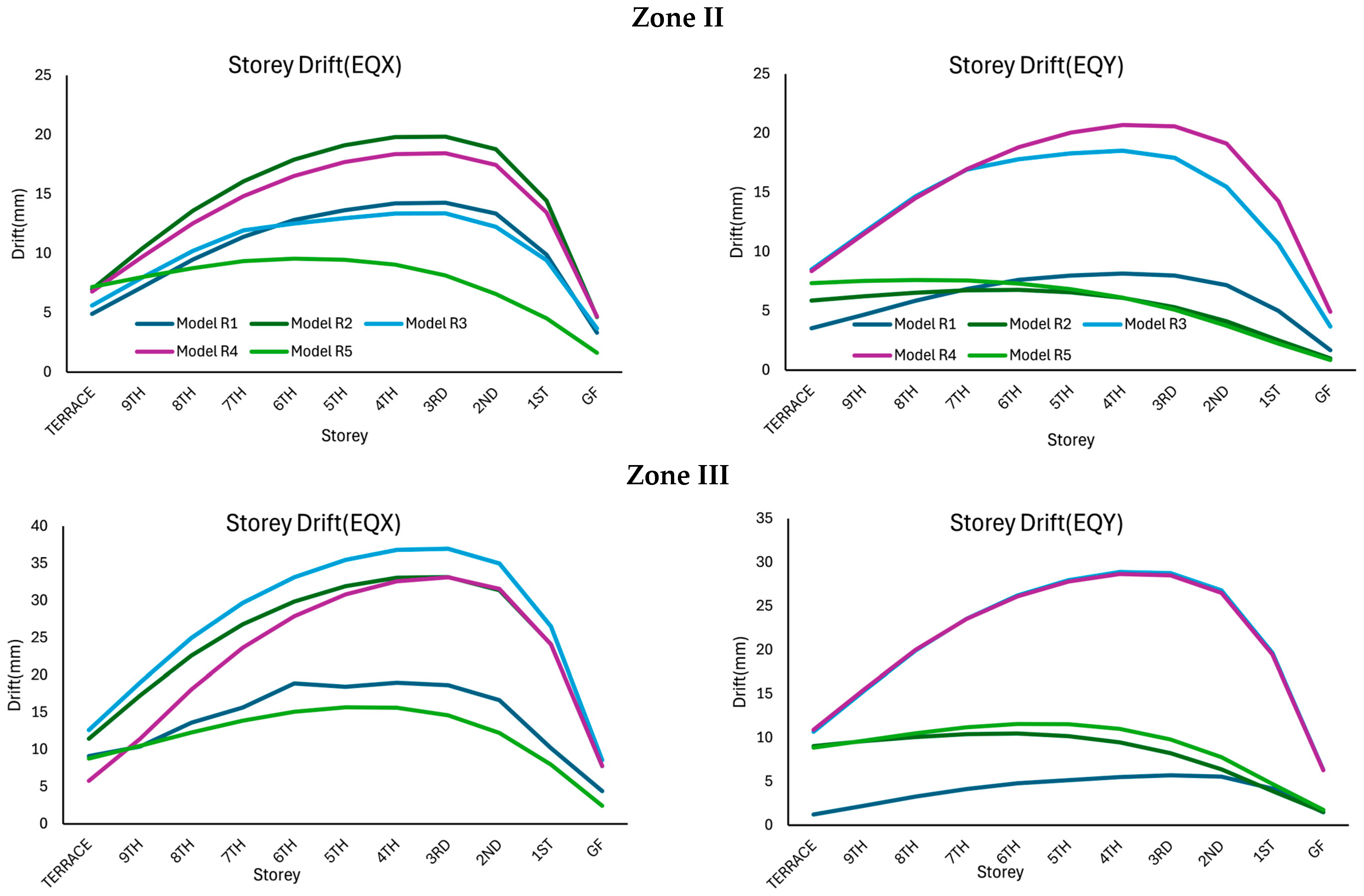 In Zone II, the maximum drift under EQX is obtained for Model R2, followed by Model R4, Model R1, Model R3, and Model R5, respectively. For the models under EQY, the maximum drift is obtained for Model R4, followed by Model R3, Model R2, Model R5, and Model R1, respectively. A similar response is obtained for the models in Zone III and Zone IV with slightly increased drift values.