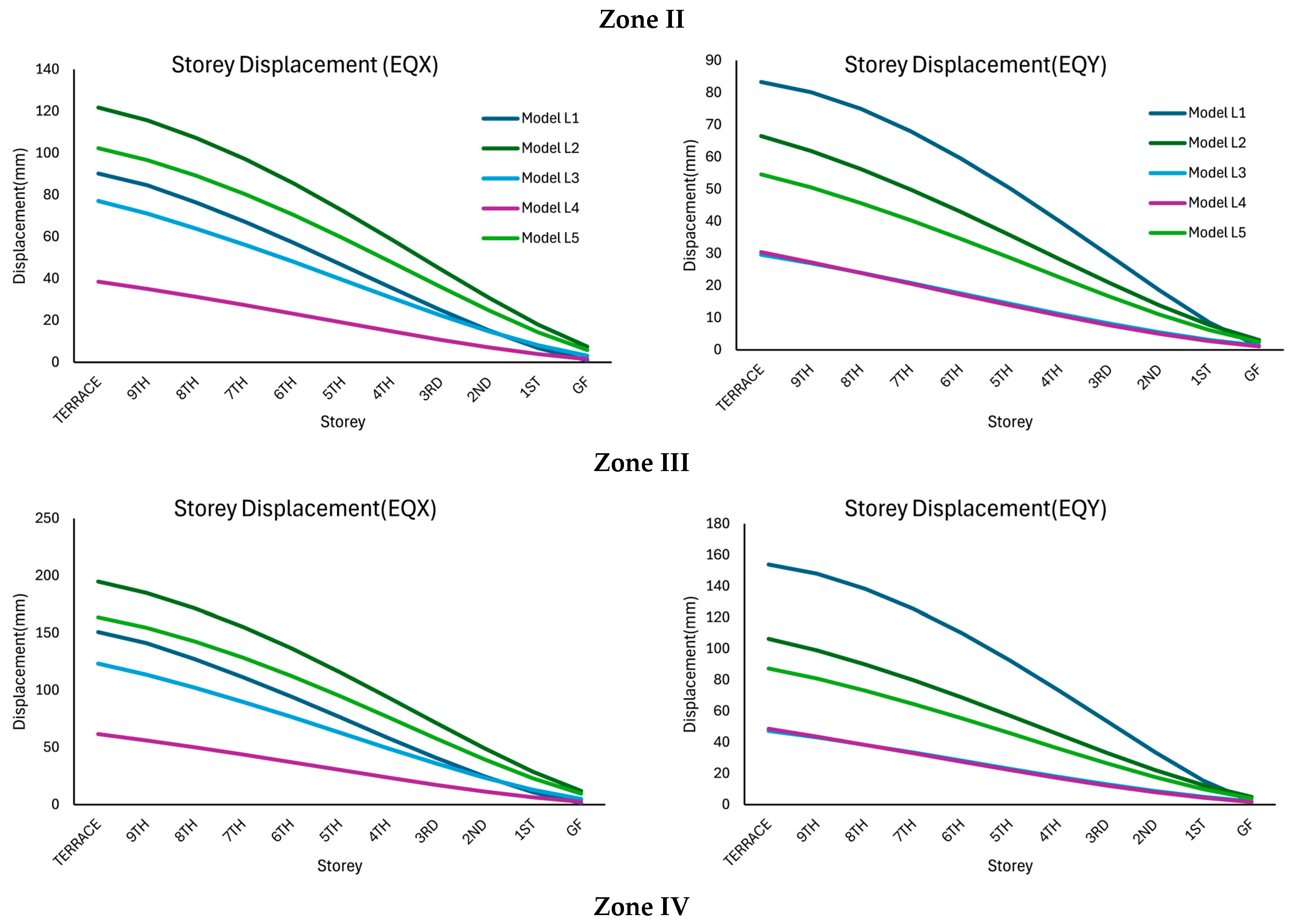 In Zone II, the terrace displacement for Model L2 was approximately 120 mm in EQX, whereas Model L5 resulted in approximately 100 mm terrace displacement in EQX. Model L1 resulted in lower terrace displacement in comparison with Model L2 and Model L5, followed by Model L3 and Model L4. Model L4 achieved minimum values of approximately 40 mm. In Zone III, all the displacements increase in comparison with the storey displacement values of Zone II, as at higher zones, the seismic forces increase. Similar to the results corresponding to EQX in Zone II, Model L2 shows the highest terrace displacement, followed by Model L5, Model L1, Model L3, and Model L4.