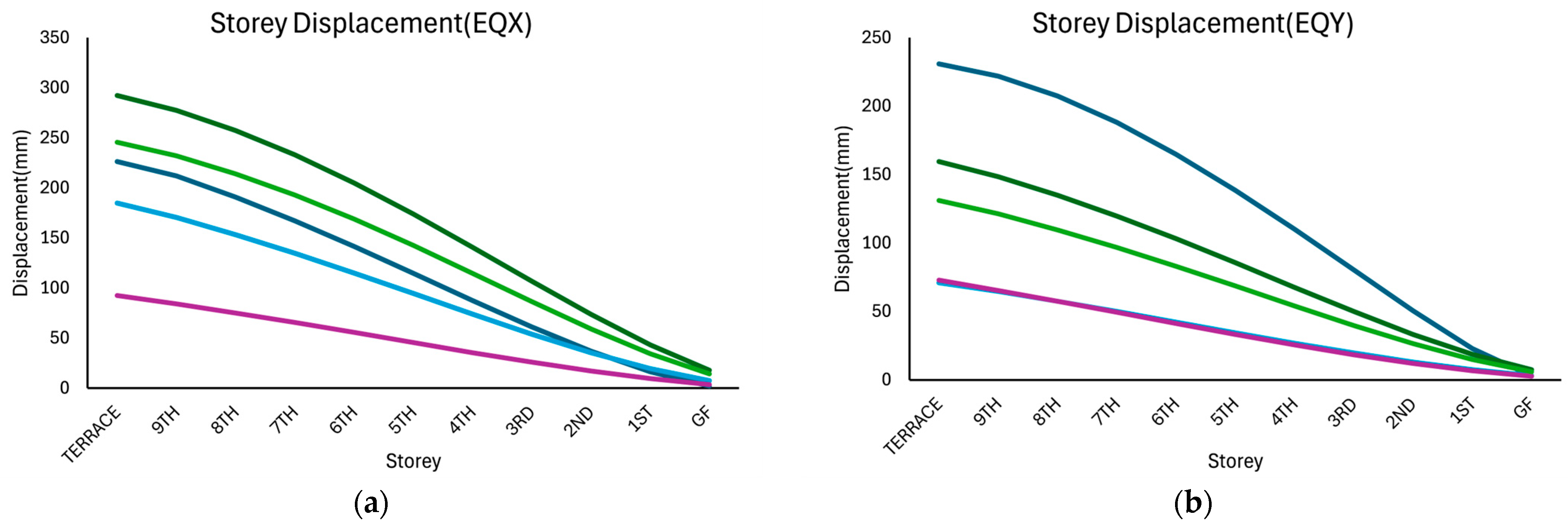 Figure 5. These responses correspond to five different shear wall configurations in the x- and y-directions. In all the cases, the base shear progressively increased from the terrace level to the ground floor because of the cumulative effect of lateral seismic forces from the upper stories.