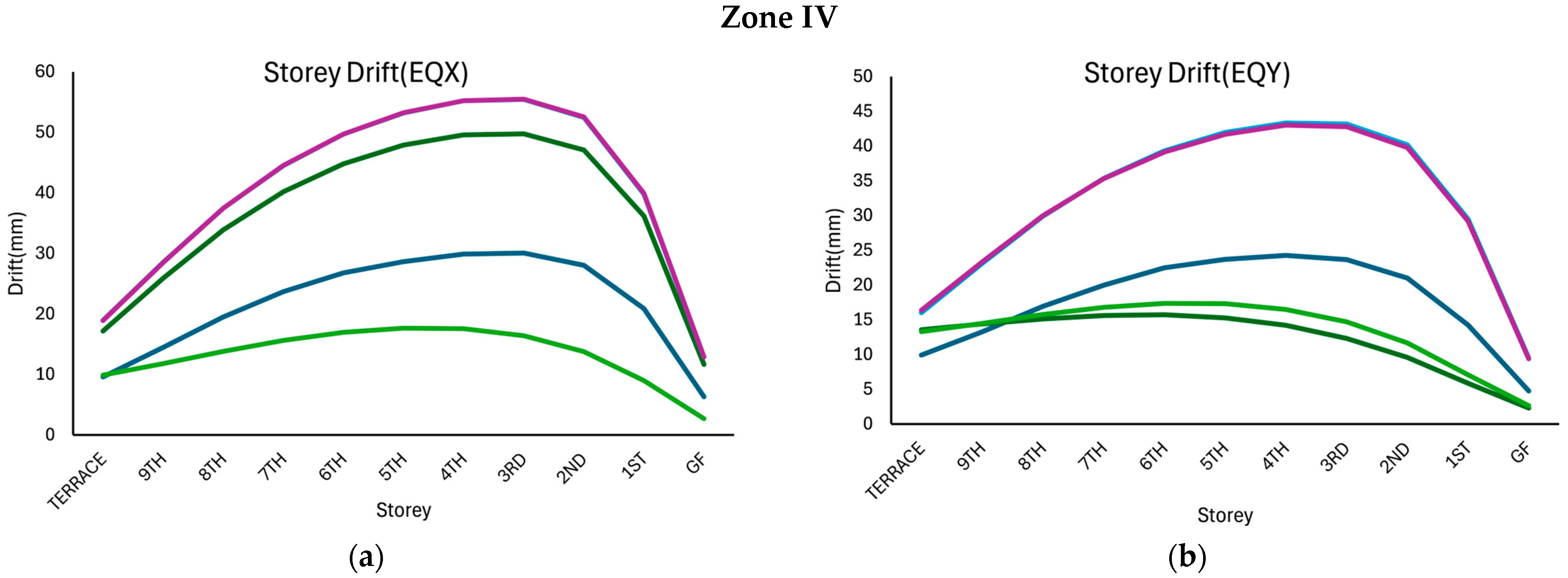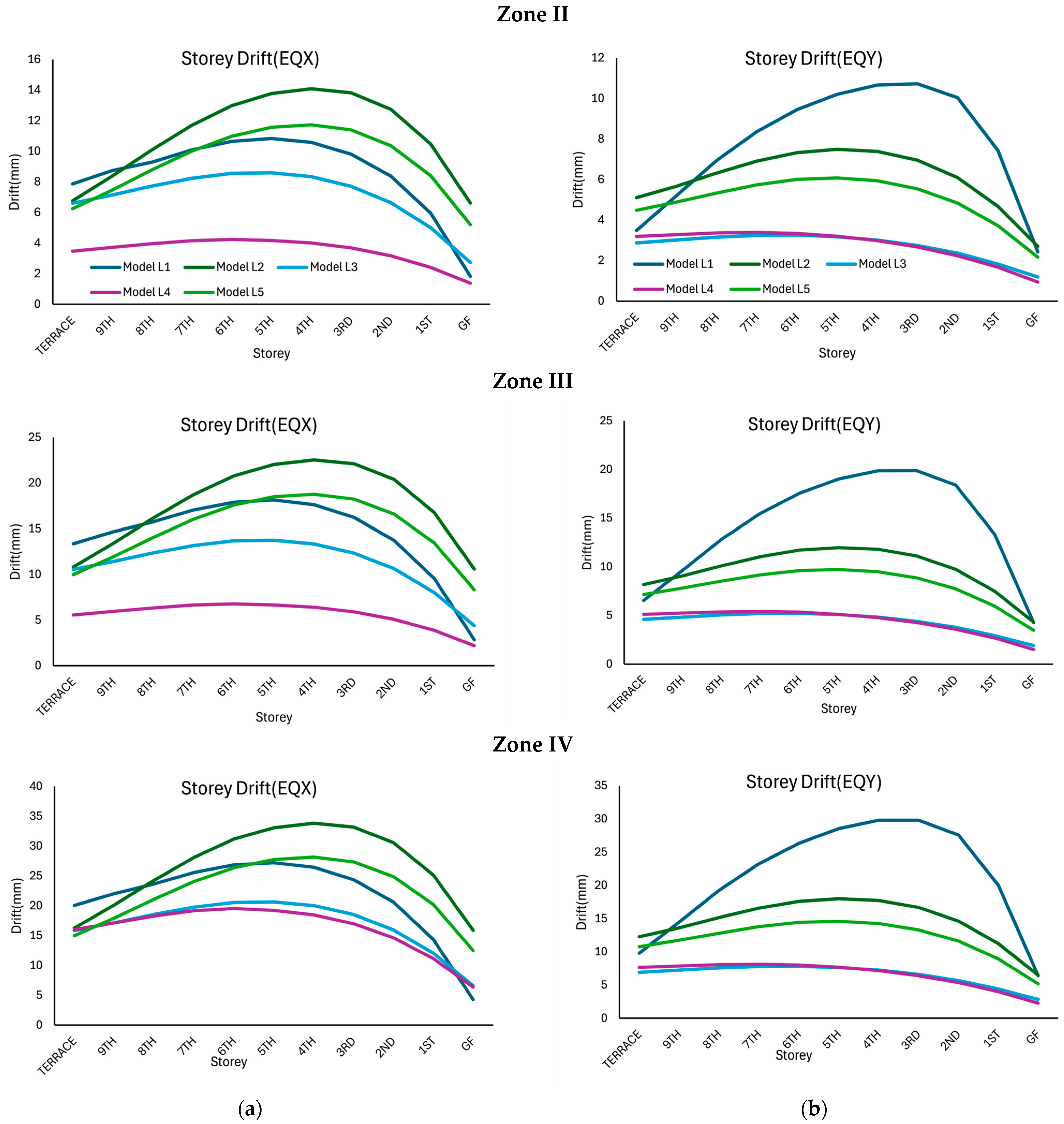 Figure 8 for Models L1–L5, under the EQX and EQY directions for seismic zones II, III, and IV. In all the cases, the drift followed a profile, with the maximum values observed at the mid-height of the building and gradually decreasing toward the base and the terrace. The drift values increased progressively from Zone II to Zone IV, reflecting the effect of higher seismic forces in more severe zones.