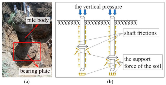 Actual construction drawings and schematic diagram of forces acting on the pile body. (a) Actual construction drawings. (b) Schematic of force on pile body.
