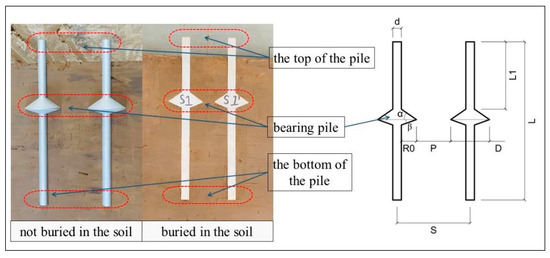 Nine identical semi-cross-sectional piles were manufactured and divided into five test groups: four pairs of piles (designated (S1, S1′), (S2, S2′), (S3, S3′), and (S4, S4′)) with varying centre-to-centre spacings and a single pile serving as the control (designated S5). A schematic and design drawing of the small-scale model pile specimens is shown in