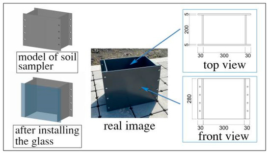 To minimise disturbances to the test soil during sampling and handling, a removable soil extraction apparatus was designed. To enable real-time observation of pile deformation and surrounding soil behaviour, particularly in light of the limited research on pile foundations both domestically and internationally, one side of the steel housing was replaced with tempered glass. The soil sampler was constructed as a cuboid (360 mm × 280 mm × 210 mm) with open ends, allowing external pressure devices to be inserted into the soil in situ. To prevent deformation under the applied pressure, which could disrupt the internal soil structure, the sampler was fabricated from materials with sufficient strength. Its sidewalls were composed of 5 mm thick steel plates. The conceptual model and physical prototype of the sampler are illustrated in