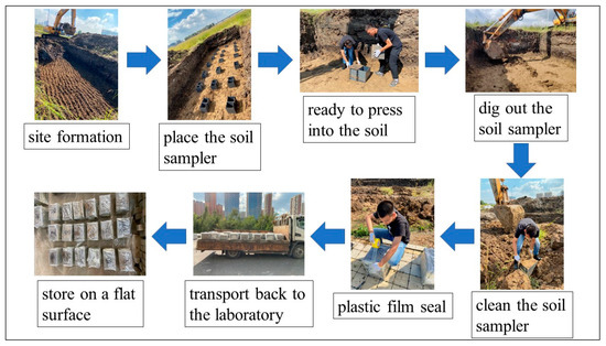 To ensure that the properties of the test soil closely resembled those of soils used in real-world projects, the loading test material was sourced from in situ soil excavated at the construction site. The upper miscellaneous fill layer, which has been subjected to prolonged anthropogenic disturbances, including construction activities, domestic waste deposition, and other factors, contains numerous impurities, rendering it unsuitable for testing. Consequently, a silty clay layer beneath the fill was selected as the test material. The undisturbed soil sampling process involved site levelling, placement of soil extractors, extraction, sealing, and transportation. This procedure is illustrated in