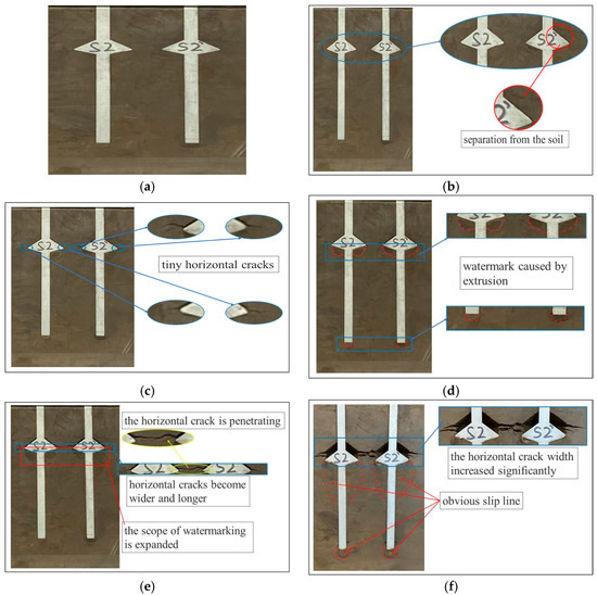 Progressive failure of soil surrounding the pile during hierarchical loading in the S2/S2′ group. (a) when not loaded, (b) 0.3 kN, (c) 0.35 kN, (d) 0.4 kN, (e) 0.55 kN, (f) at ultimate load.